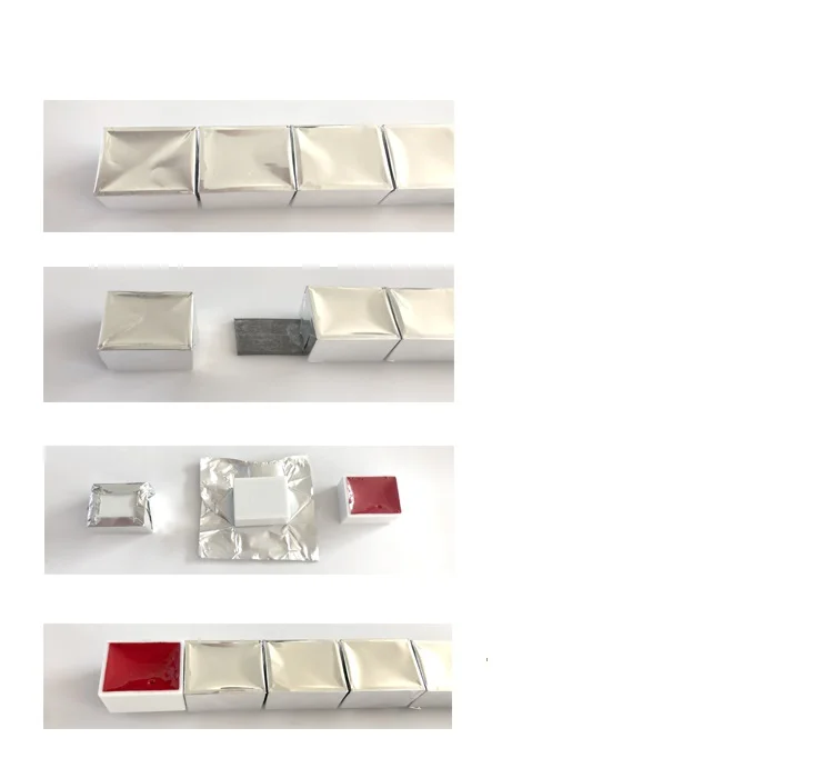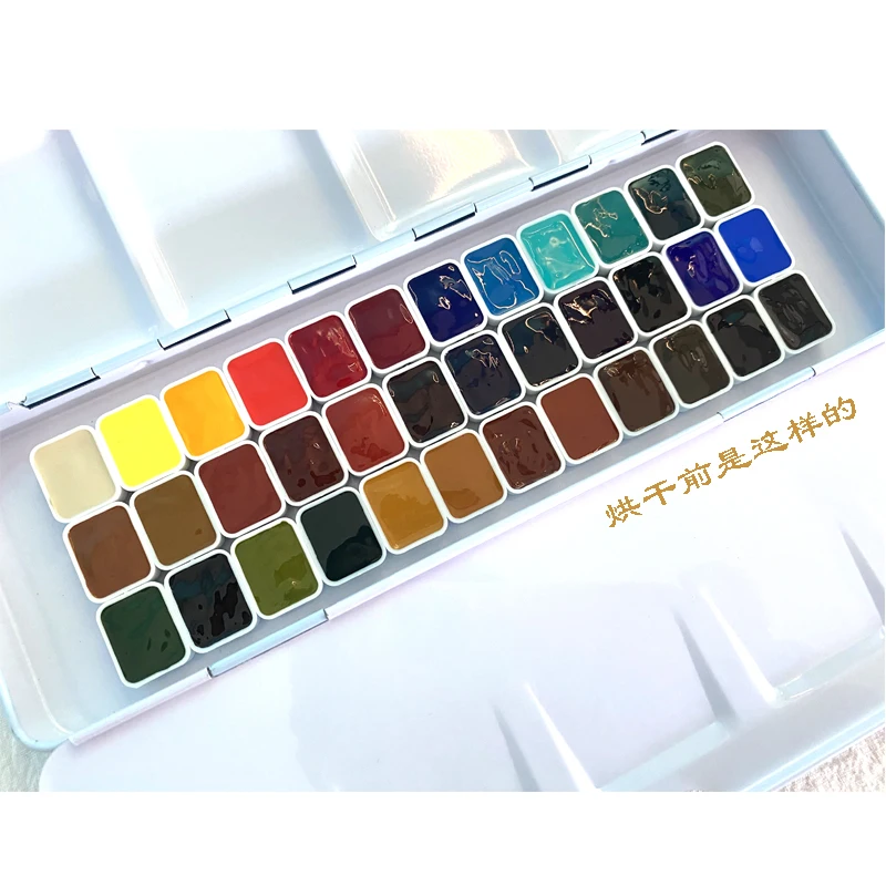 Watercolors are made from the original tubes without adding anything, and squeezed directly into the packing grid by hand Pigmentsare measured in accordance with the paste ml production,drying process, the water inside the evaporation of the remaining pure orecolor powder, will form around the high middle concave solid form, differentcolor shrinkage degree, and even cracking. After receiving it, as long as youadd some water or media to moisten it, it will become a paste, which will notaffect normal use