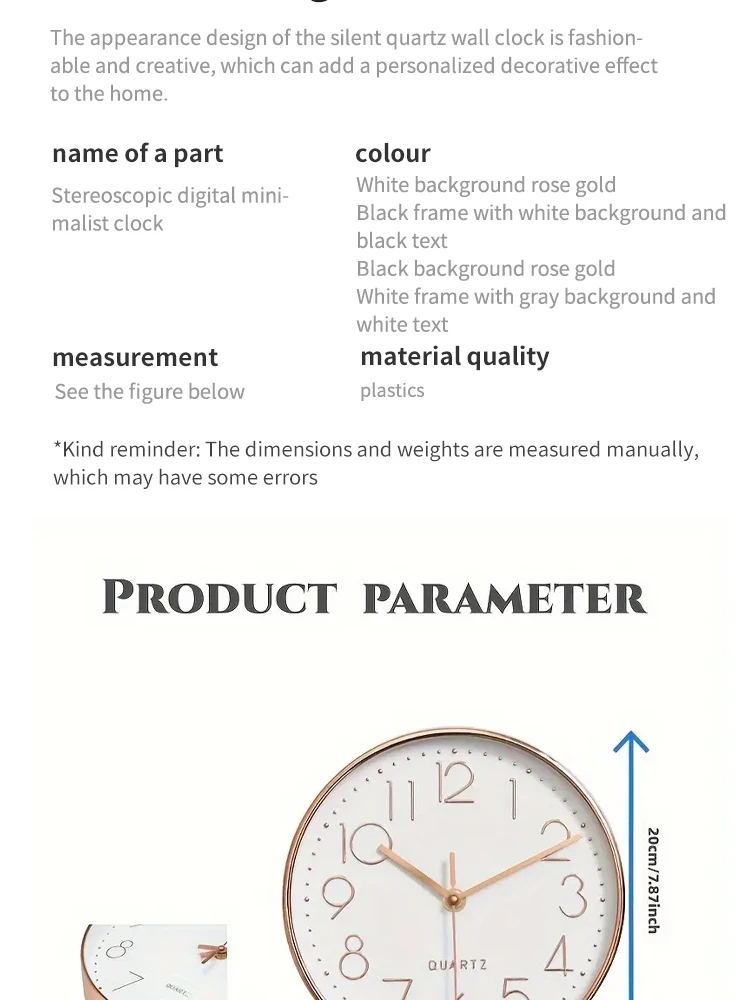 Nome del prodotto Orologio da parete silenzioso al quarzo da 8 pollici