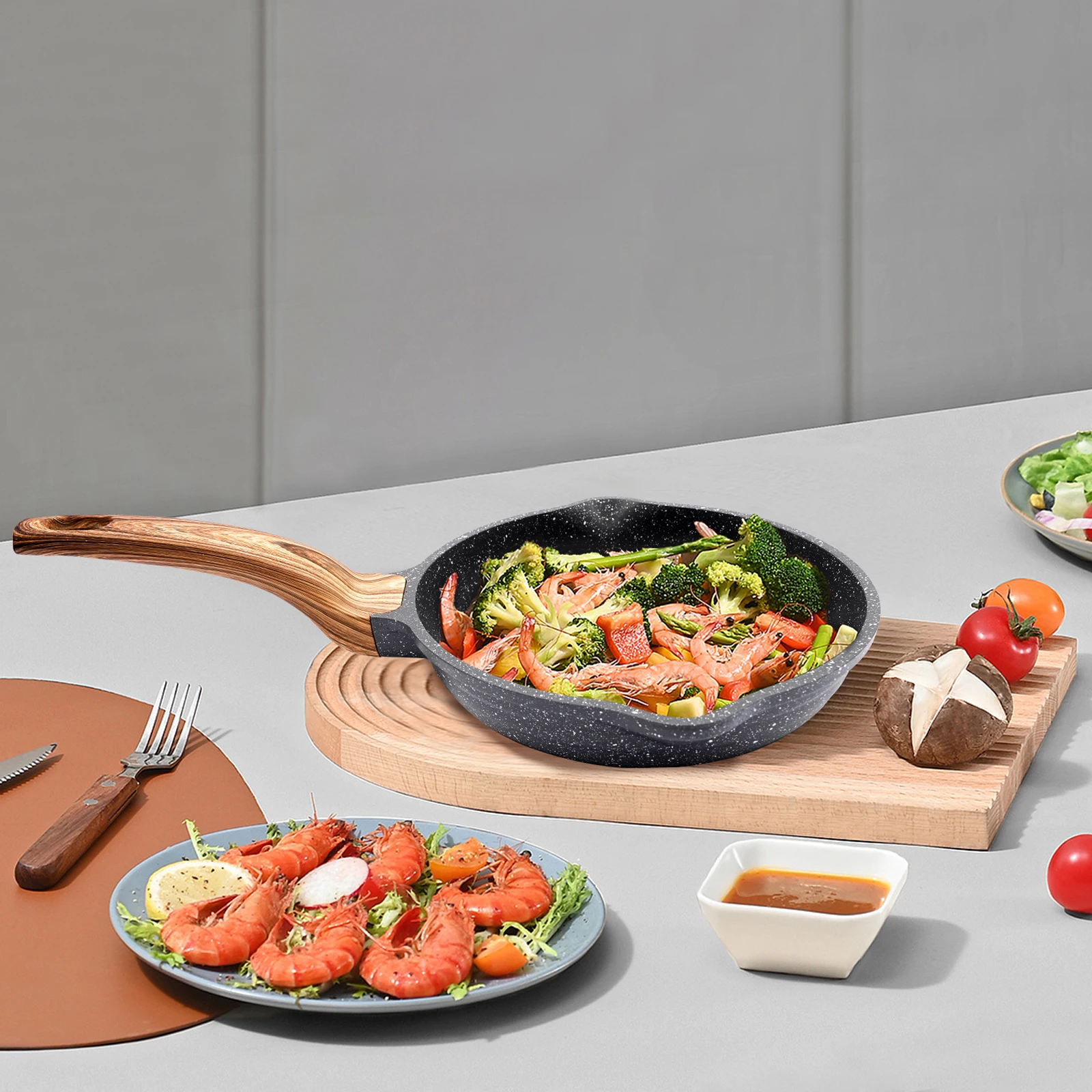 Prestazioni eccellenti: la base della padella composita in ferro può essere adattata a diversi tipi di stufe e può guidare rapidamente il calore, consente anche il riscaldamento e il rivestimento antiaderente rende il cibo meno probabilmente attaccare alla padella, quindi può riscaldare i tuoi ingredienti rapidamente e goditi un delizioso.