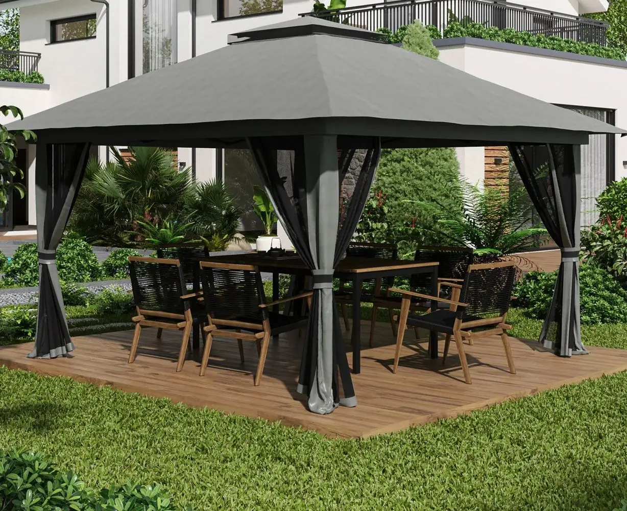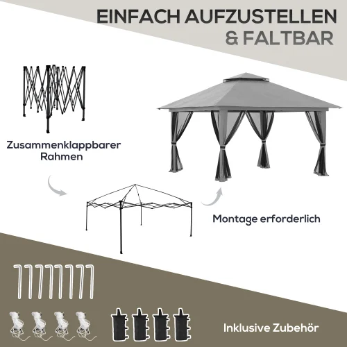 Stabile e sicuro: Il padiglione è fissato al pavimento con increspature, corde tenditrici e tenditori (il serbatoio tenditori possono essere riempito con 12,5 kg di sabbia o 9,5 kg d’acqua ciascuno) per garantire elevata stabilità.Diverse aperture di drenaggio impediscono l’acqua piovana da accumulare sul tetto.Il tetto di ventilazione garantisce una piacevole scambio d’aria e garantisce più stabilità nel vento.