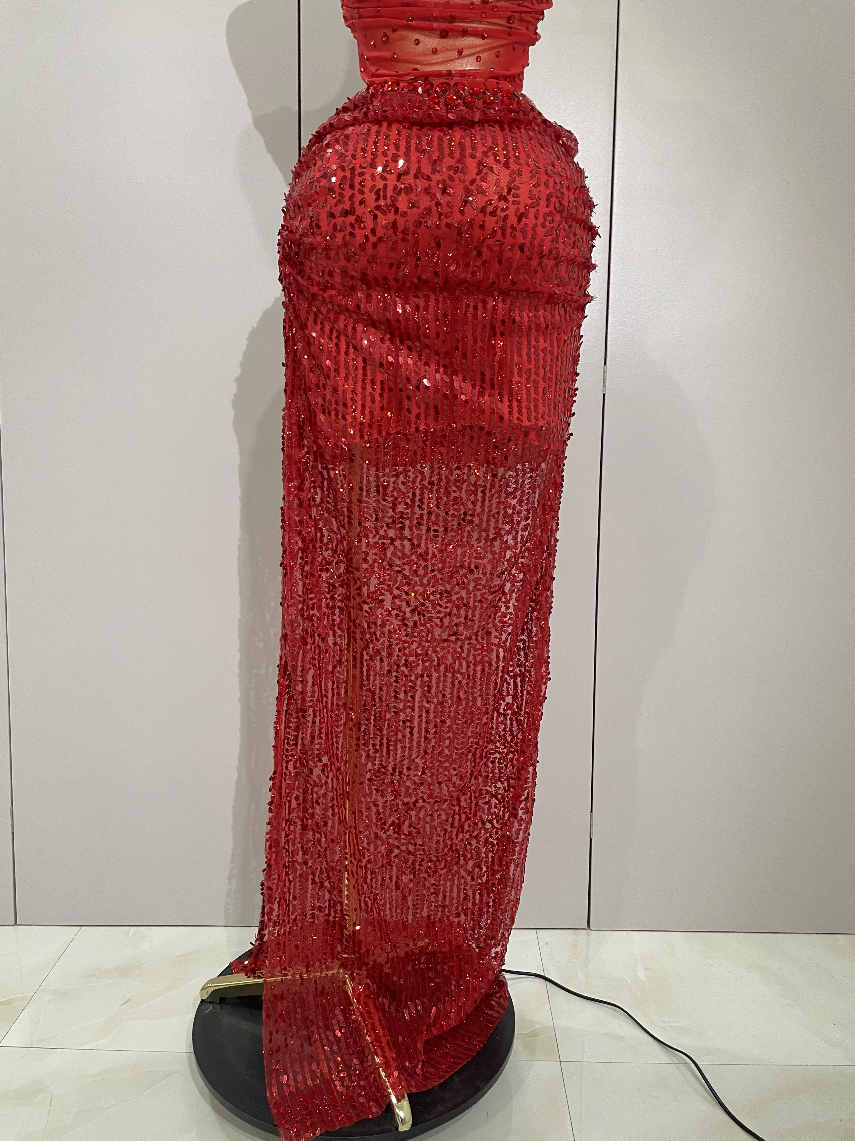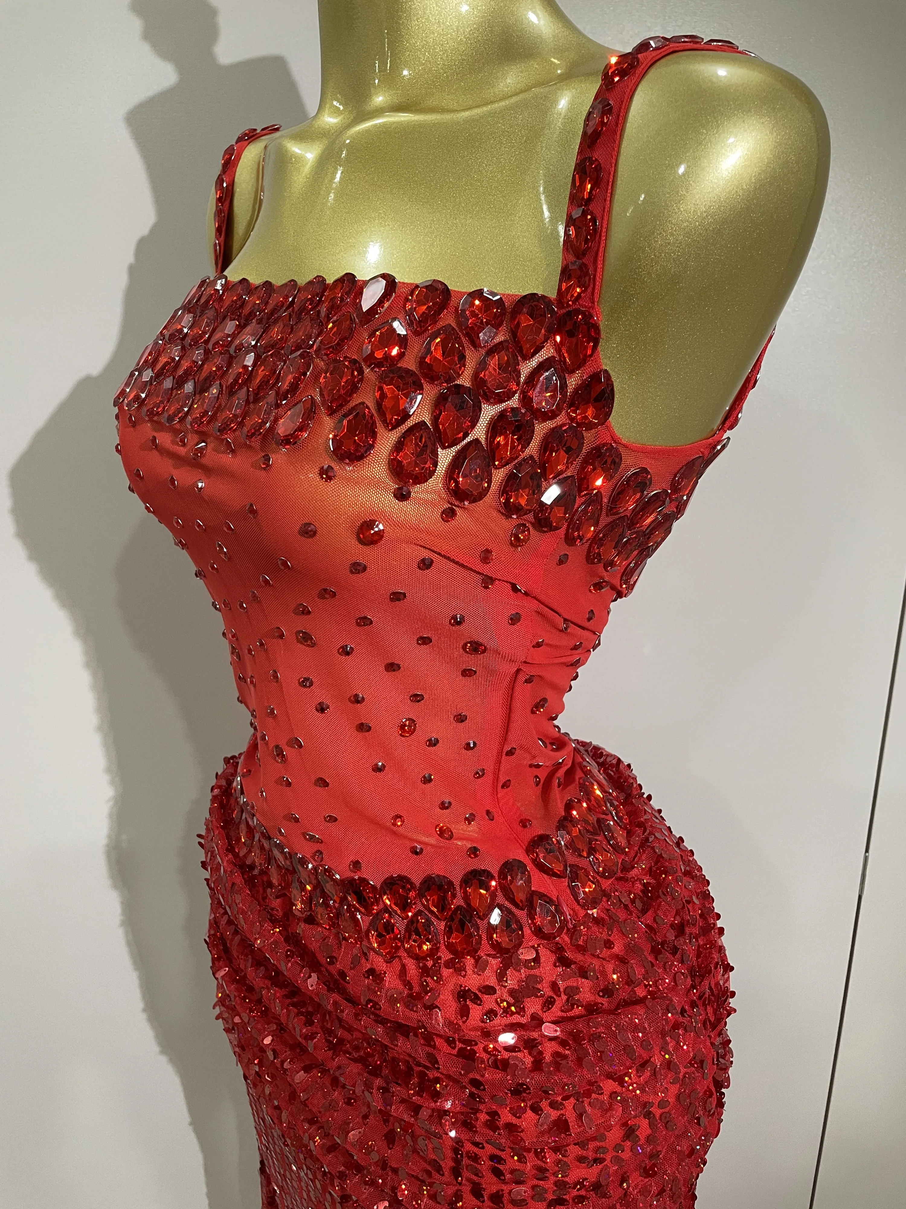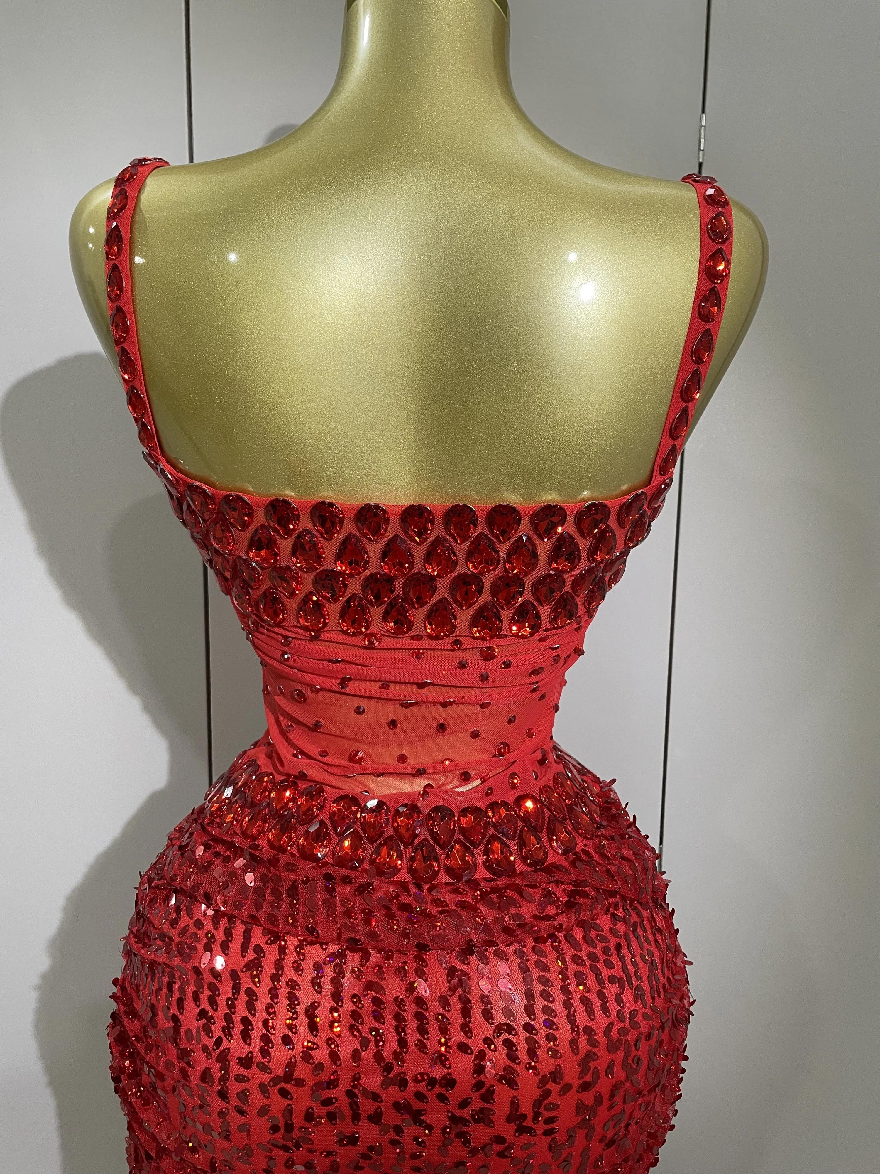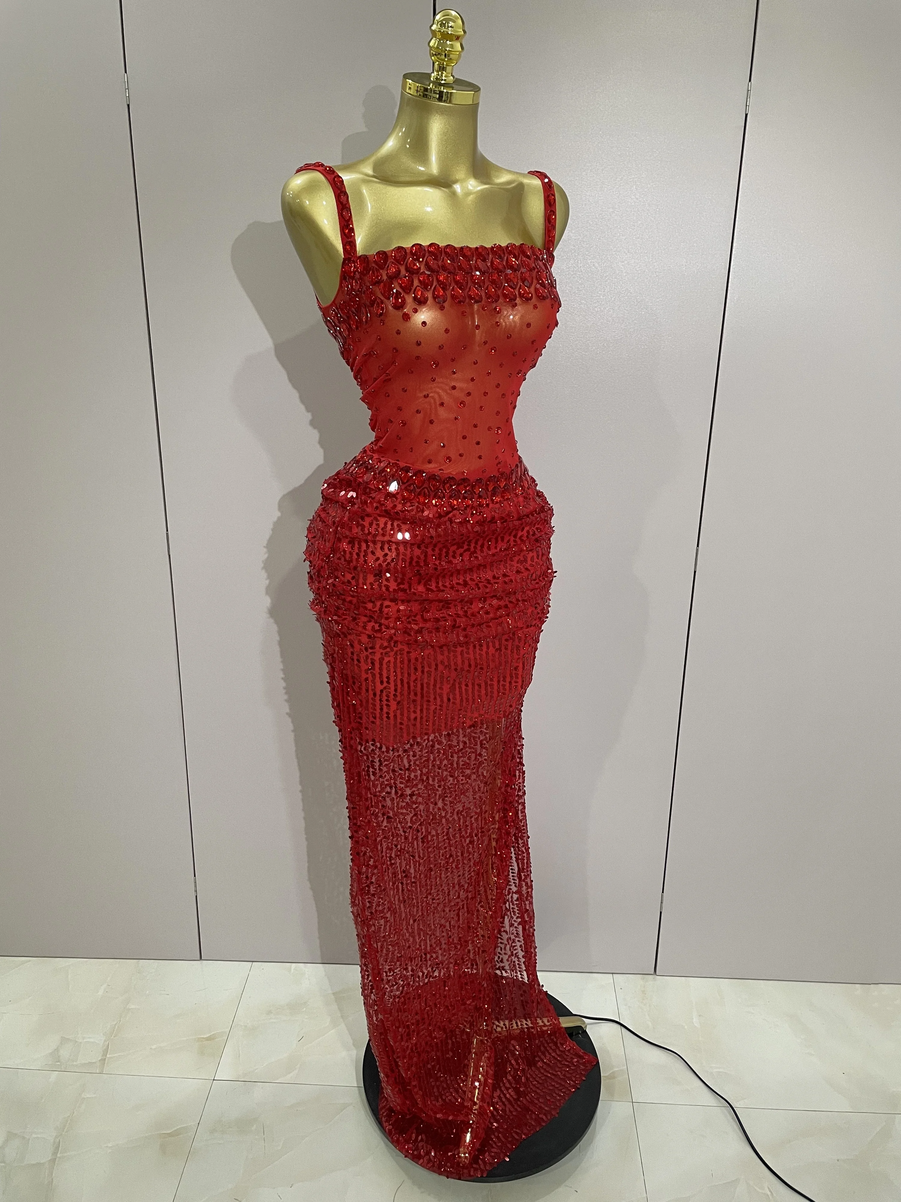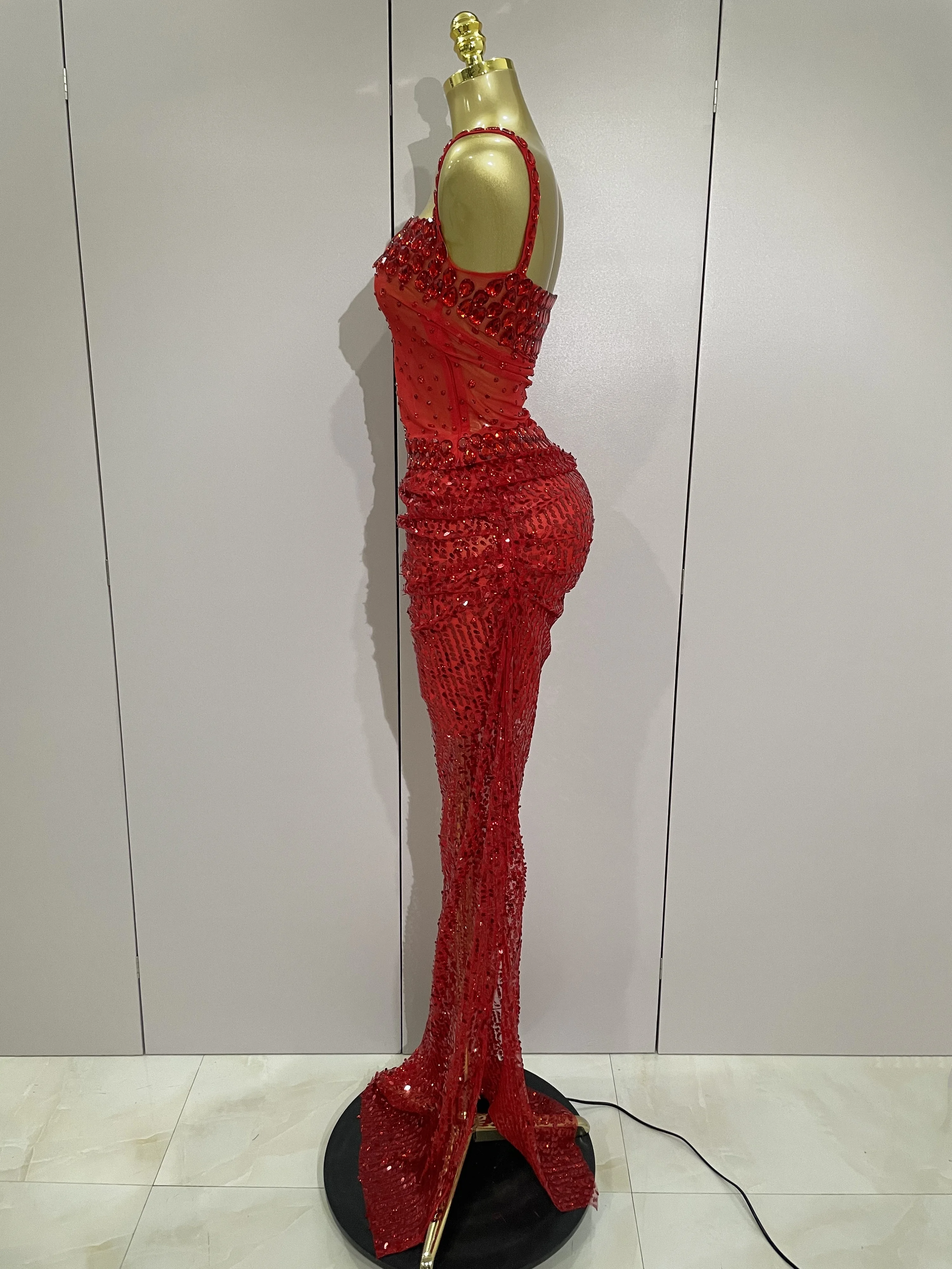 Paillettes scintillanti con strass rossi sexy vedere attraverso 2 pezzi abito lungo 2025 donne celebra abiti da festa di compleanno serali costumi di scena