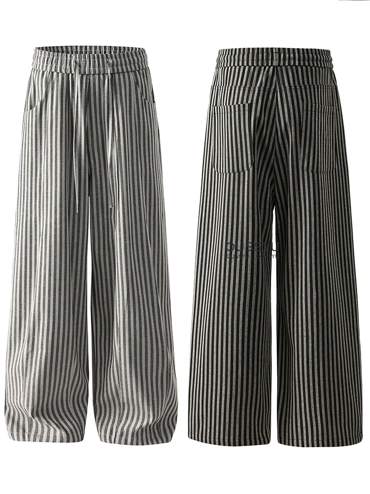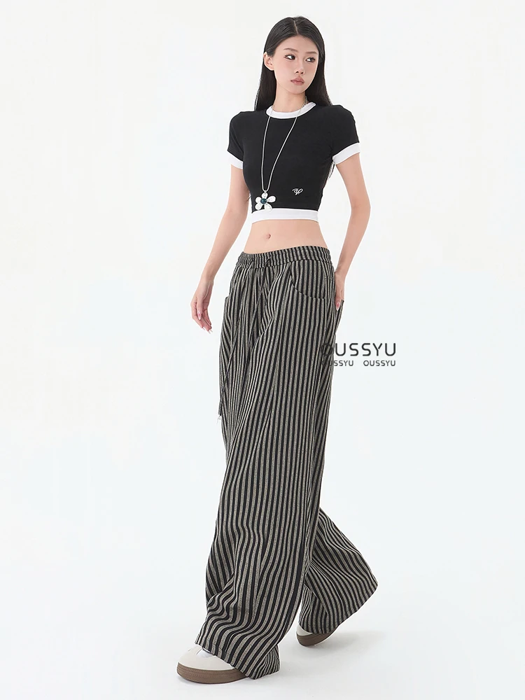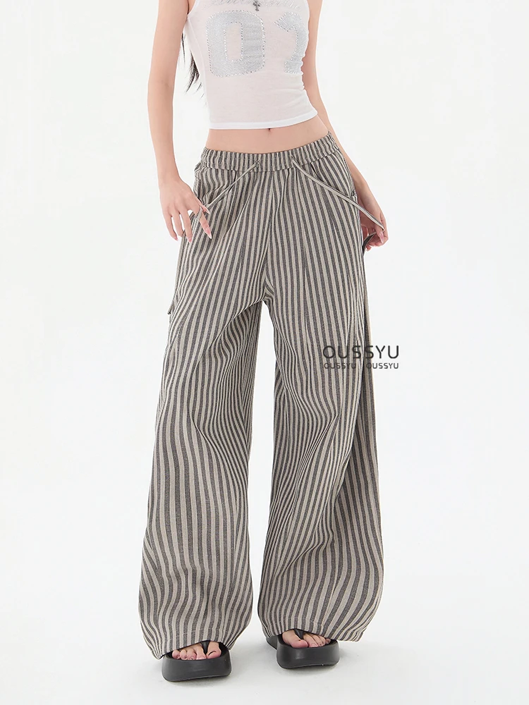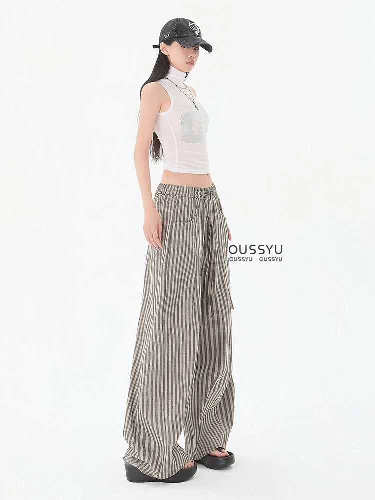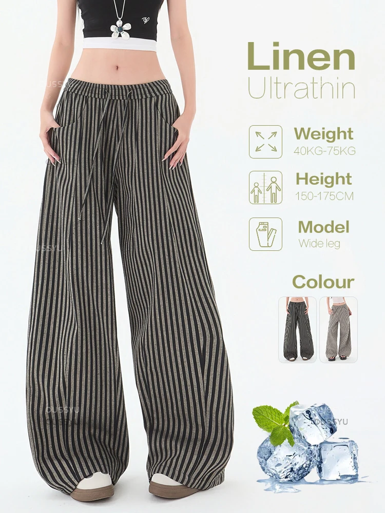 Pantaloni casual a righe in tessuto di lino di lusso estivo Pantaloni larghi da donna Pantaloni larghi da pavimento Tendenza moda femminile Pantaloni accoglienti Ragazza XS-XXL