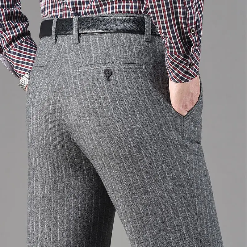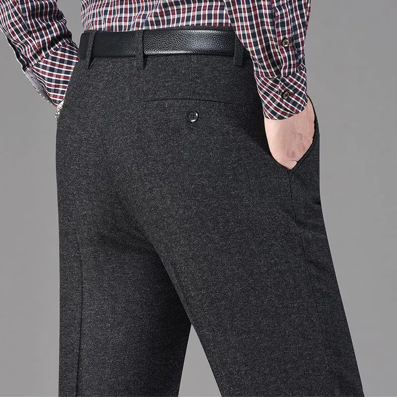 Pantaloni da abito in pile di lana addensata autunno inverno vintage da uomo Pantaloni dritti casual da lavoro larghi a vita alta di mezza età