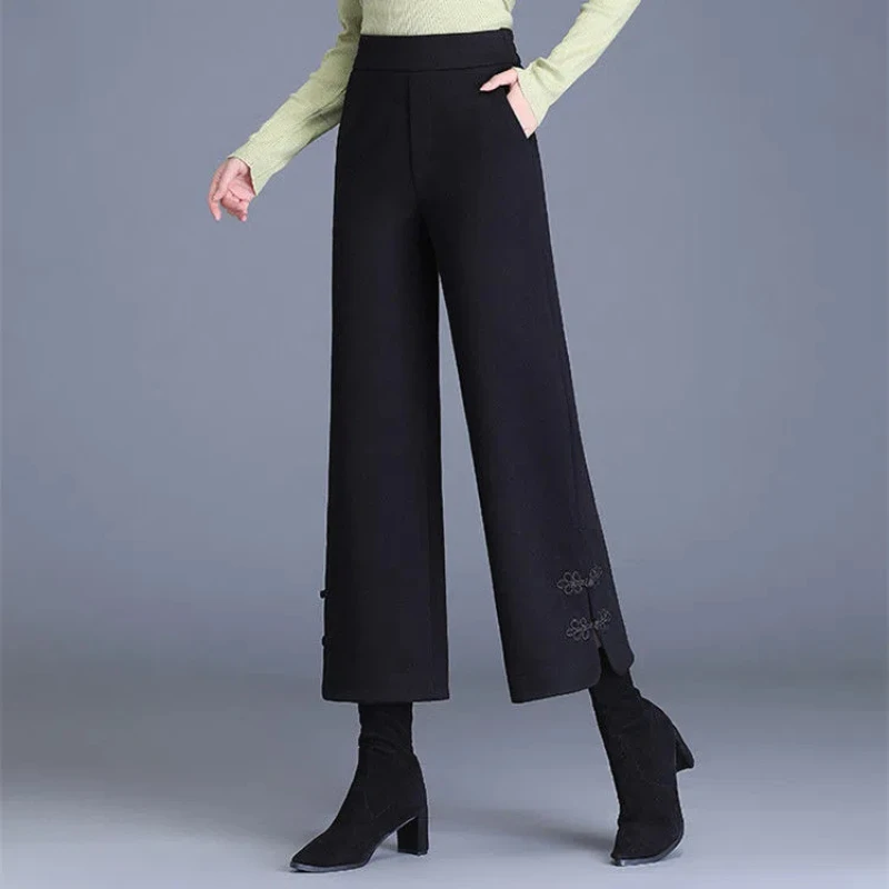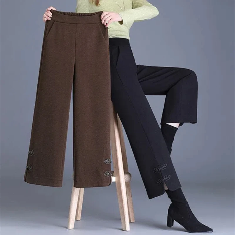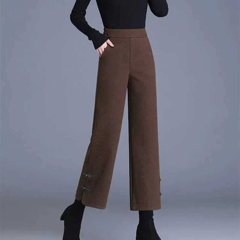 Pantaloni di lana autunno inverno moda Vintage donna Solid Elastic tasche a vita alta rana pantaloni dritti a gamba larga alla caviglia