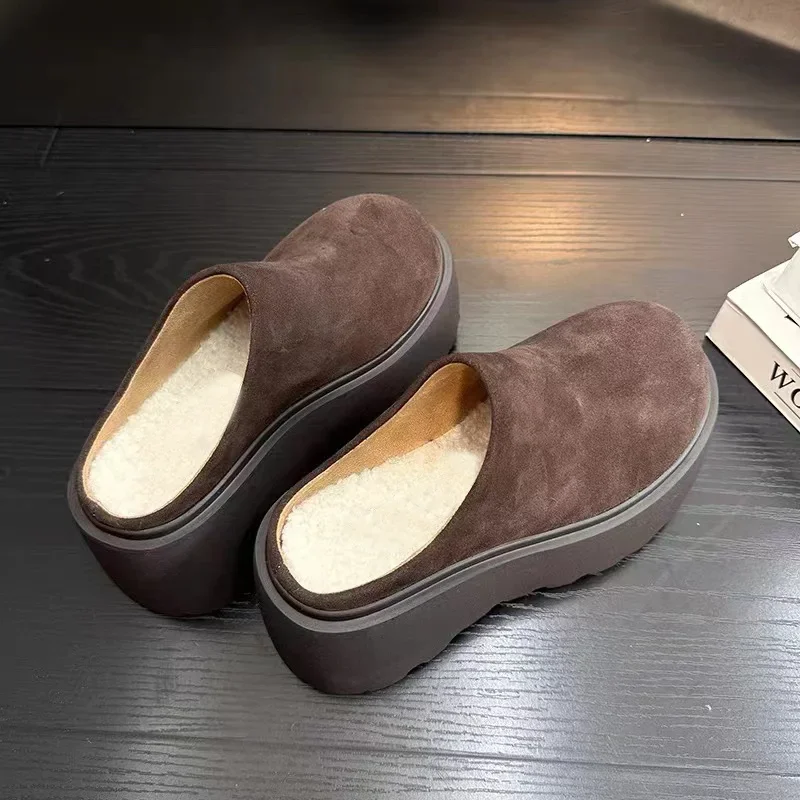 Pantofole da donna con fondo spesso in peluche retrò autunno/inverno 2025 per abbigliamento esterno, pantofole Baotou antiscivolo con altezza crescente