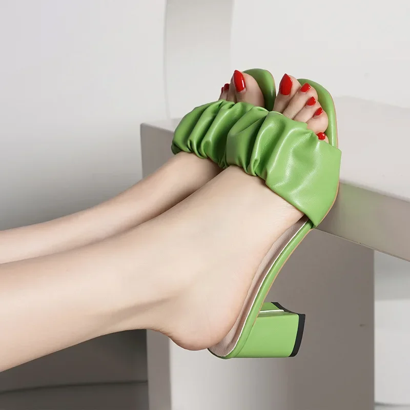 Pantofole da donna estive nuove con tacco grosso Sandali da donna eleganti casual con punta quadrata pieghettata verde arancione