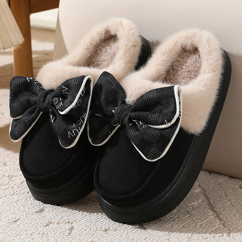 Pantofole in cotone solido caldo con punta invernale da donna con fiocco adorabile Scivoli con suola morbida e spessa Scarpe antiscivolo per la casa piatte da pavimento per interni