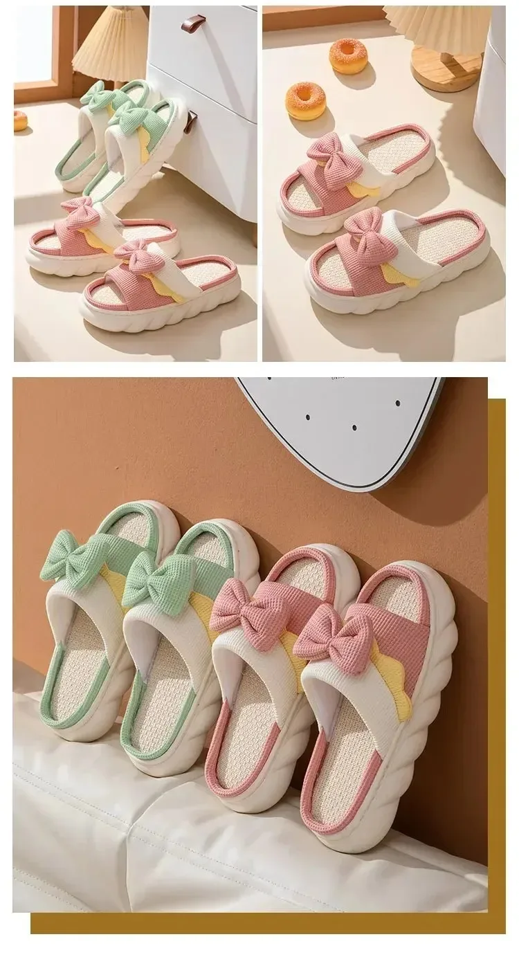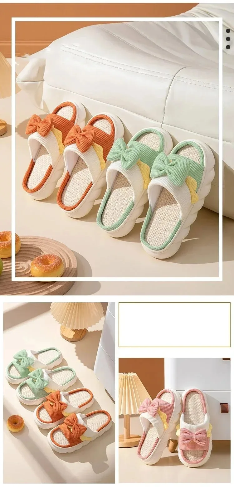Pantofole in lino Pantofole da interno da donna Comode scarpe antiscivolo in cotone per la casa Scivoli per coppie con pantofole piatte con fiocco carino
