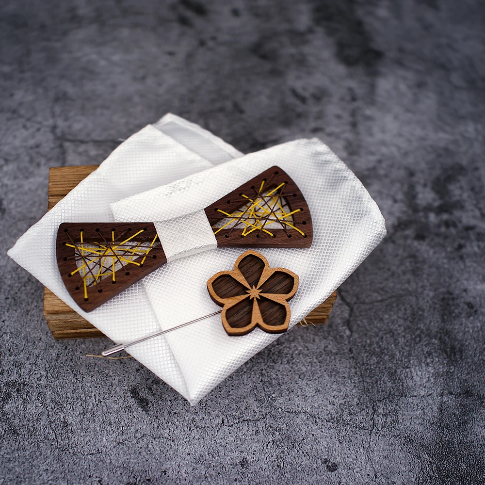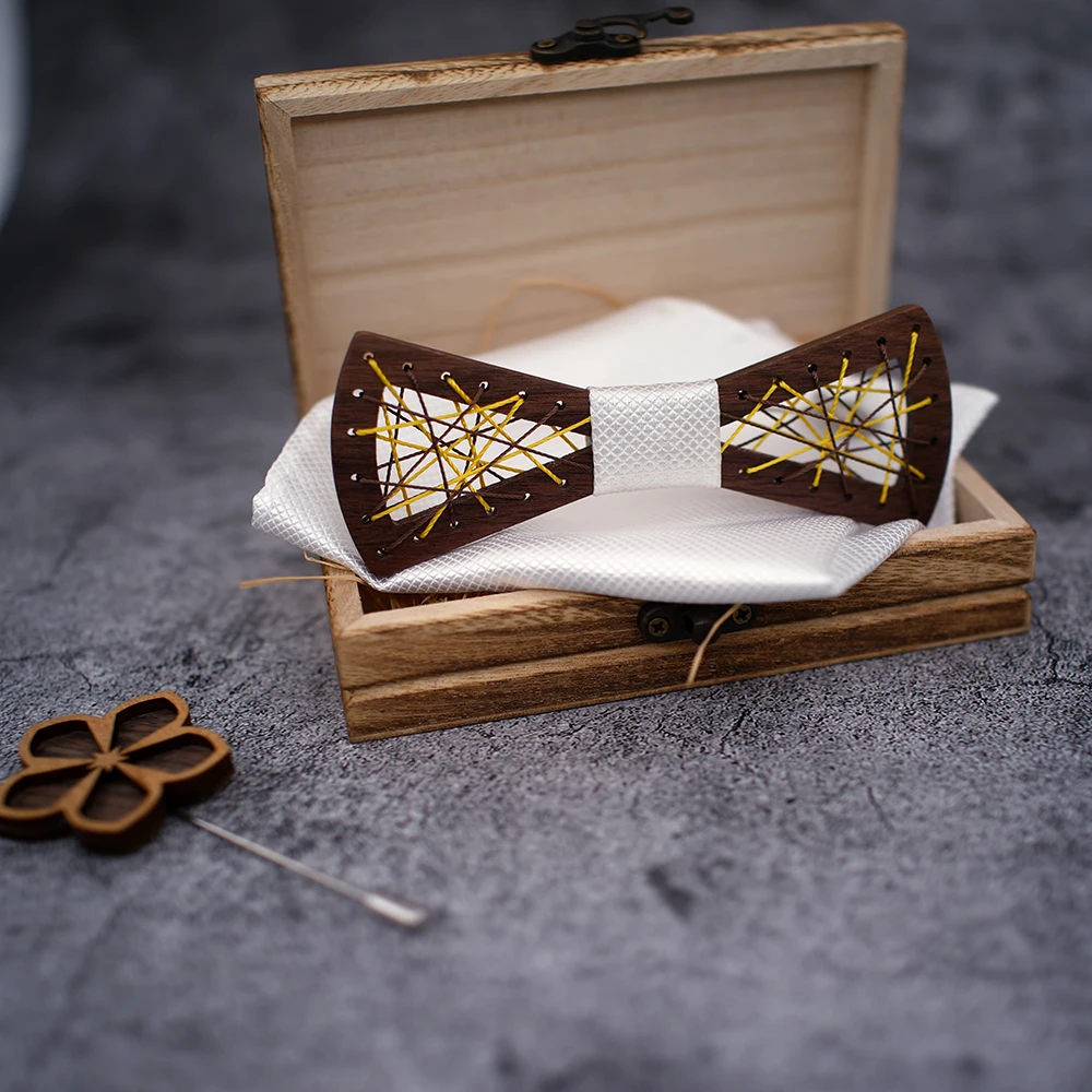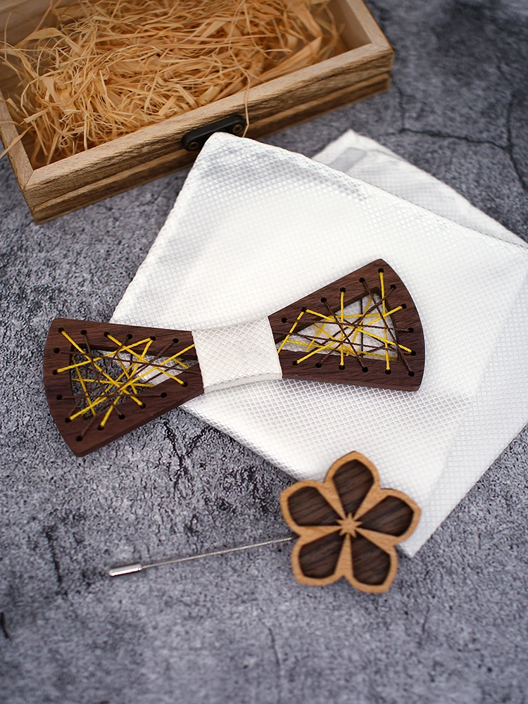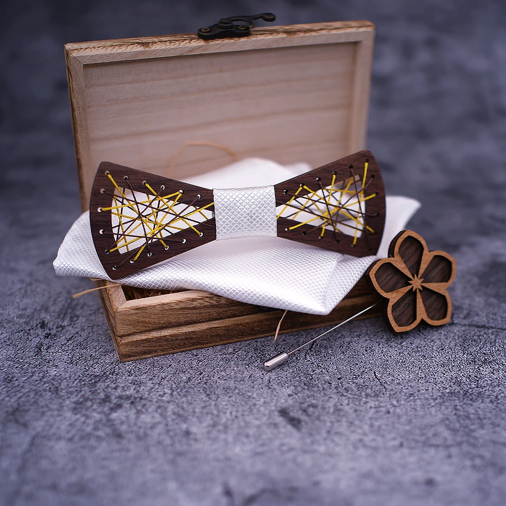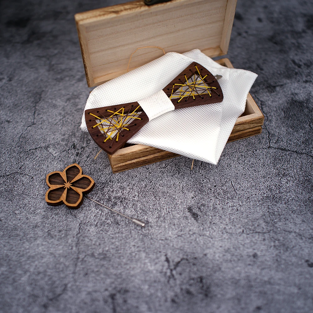 Papillon in legno da uomo papillon in legno intagliato tasca gemelli quadrati Set papillon floreale scatola di legno vestito Business Wedding