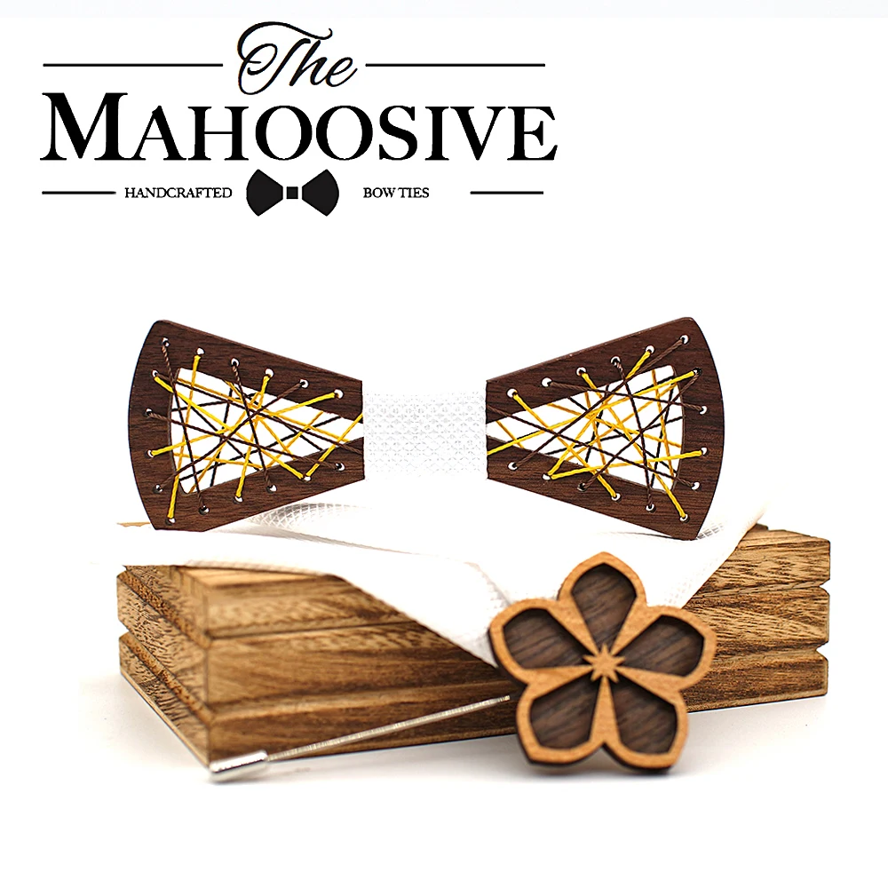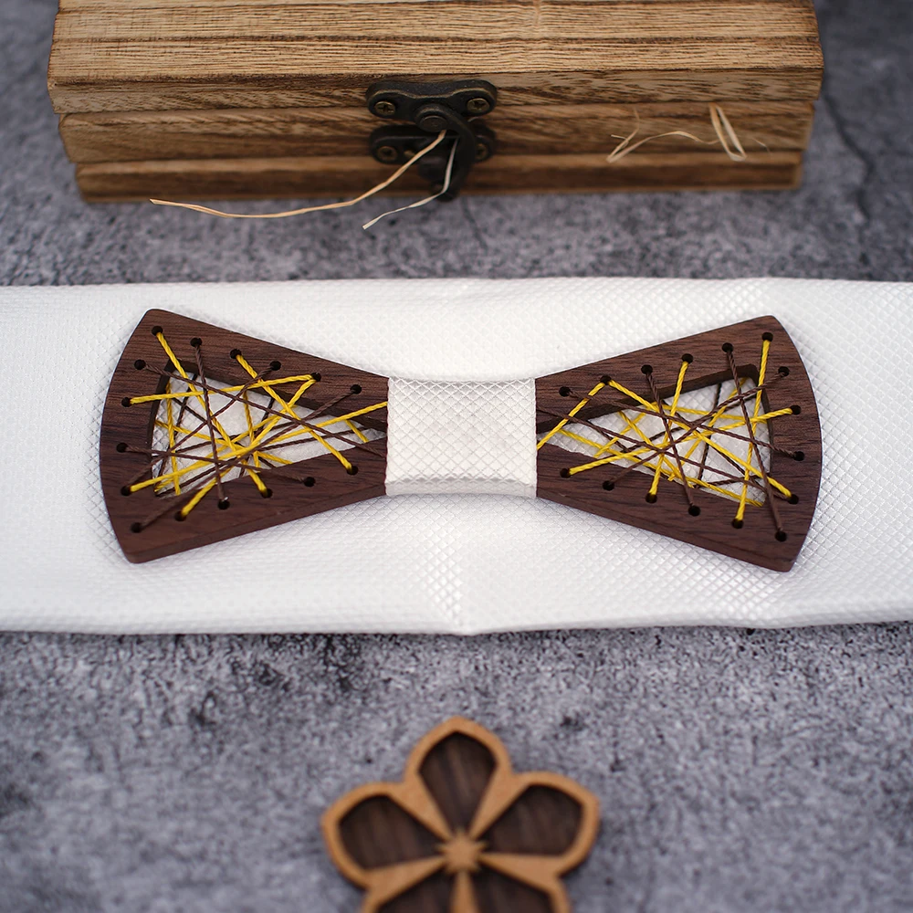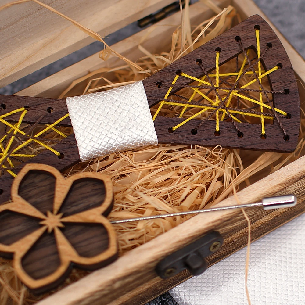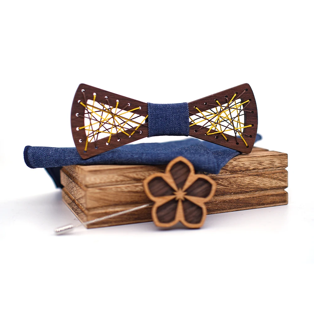 Papillon in legno da uomo papillon in legno intagliato tasca gemelli quadrati Set papillon floreale scatola di legno vestito Business Wedding