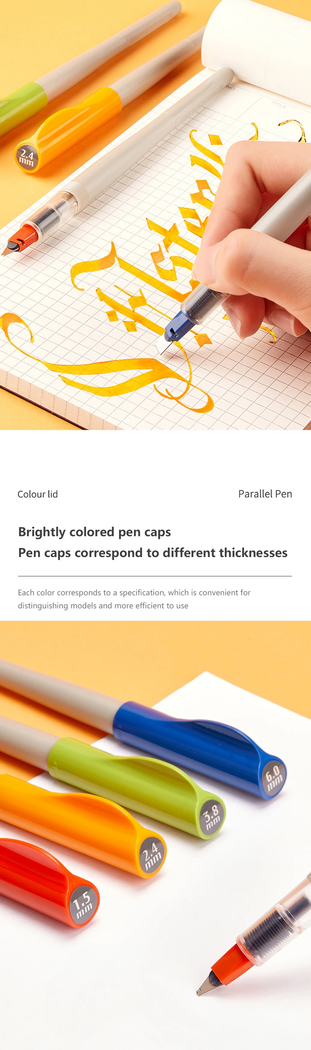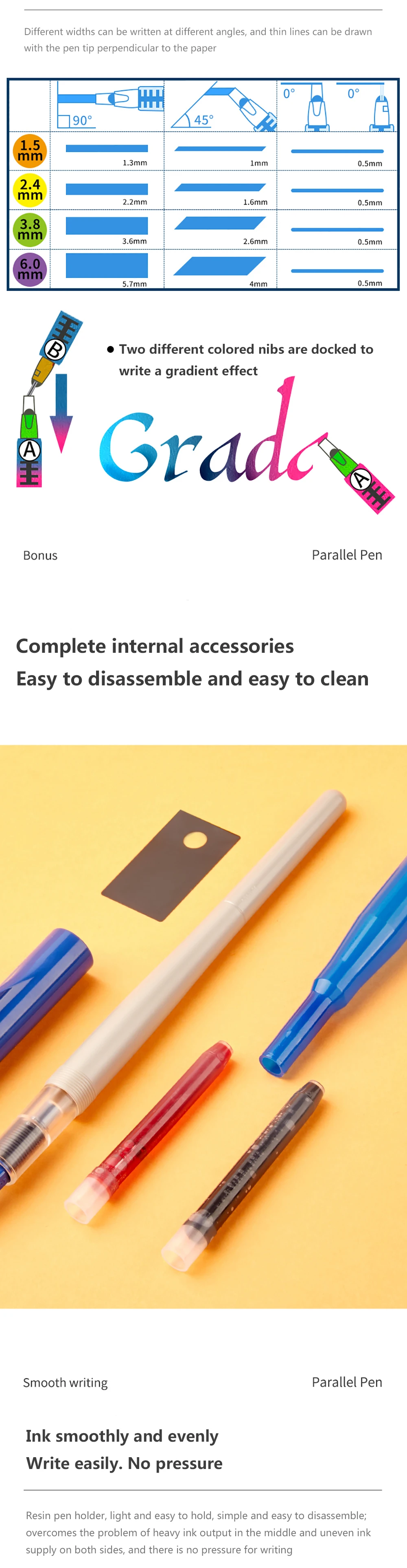 La penna parallela ha due pezzi metallici paralleli nella punta, che consentono una scrittura fluida e un’ampia gamma di larghezze (0,5~3,6 mm) e una larghezza della linea di 0,5 mm per la scrittura verticale. La costruzione unica rende facile disegnare una linea sottile ha una penna a immersione che non può essere paragonata alla comodità, ma può anche scrivere un colore sfumato, che è la caratteristica della penna parallela Baile, questa penna può scrivere in stile gotico, italiano e altri inglesi, non è raccomandato per l’uso quotidiano della scrittura.