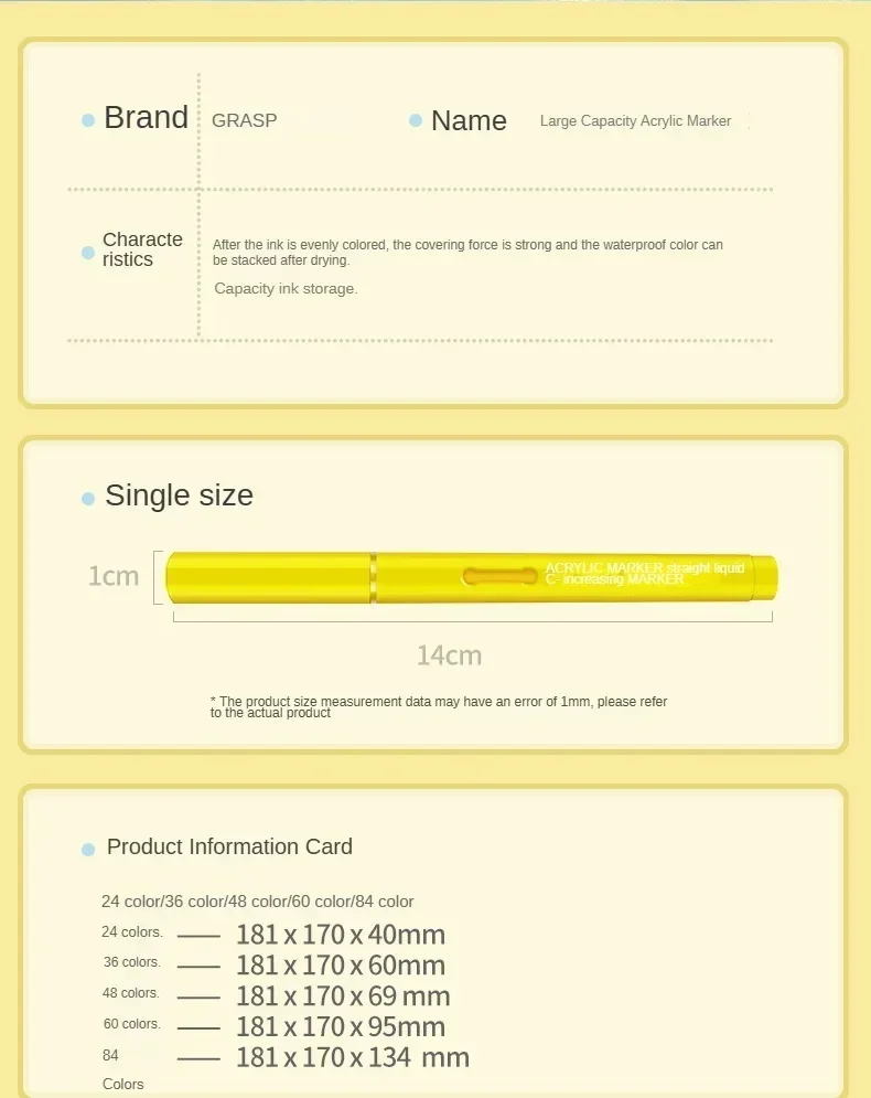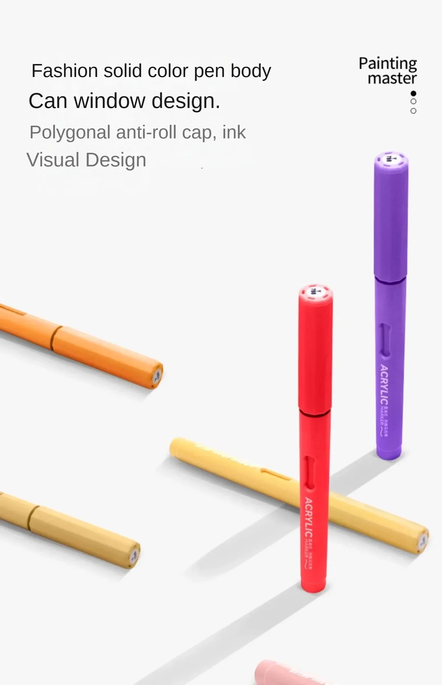 The GRASP brand-new direct-ink soft nib acrylic marker pen leads the new art trend with its intelligent ink control system! Each drop of ink is finely adjusted to ensure even ink flow and uninterrupted smoothness. The fashionable solid-color pen body, integrated with a creative color chart design, brightens up your personal style and makes every creation a collision of color and inspiration. The polygonal anti-roll design, paired with an ink visibility window, offers sufficient ink and loads of inspiration, covering every inch of your dream canvas. The GRASP self-researched patented technology creates exceptional quality, making the path to art even broader. The high-elastic fiber soft nib is flexible enough to switch between thick and thin lines freely, blend colors effortlessly, and present delicate color gradients, making your works layered and preventing ink separation. With superior coverage, you can create with peace of mind, enjoying light strokes and continuous ink flow, painting as smoothly as clouds floating in the sky. The long-lasting color display remains vibrant and fresh on various materials, easy to apply and resistant to fading, leaving a lasting artistic impression. The diverse color palette, crafted with ingenuity, provides a carefully planned color matching scheme for every creation of yours.
