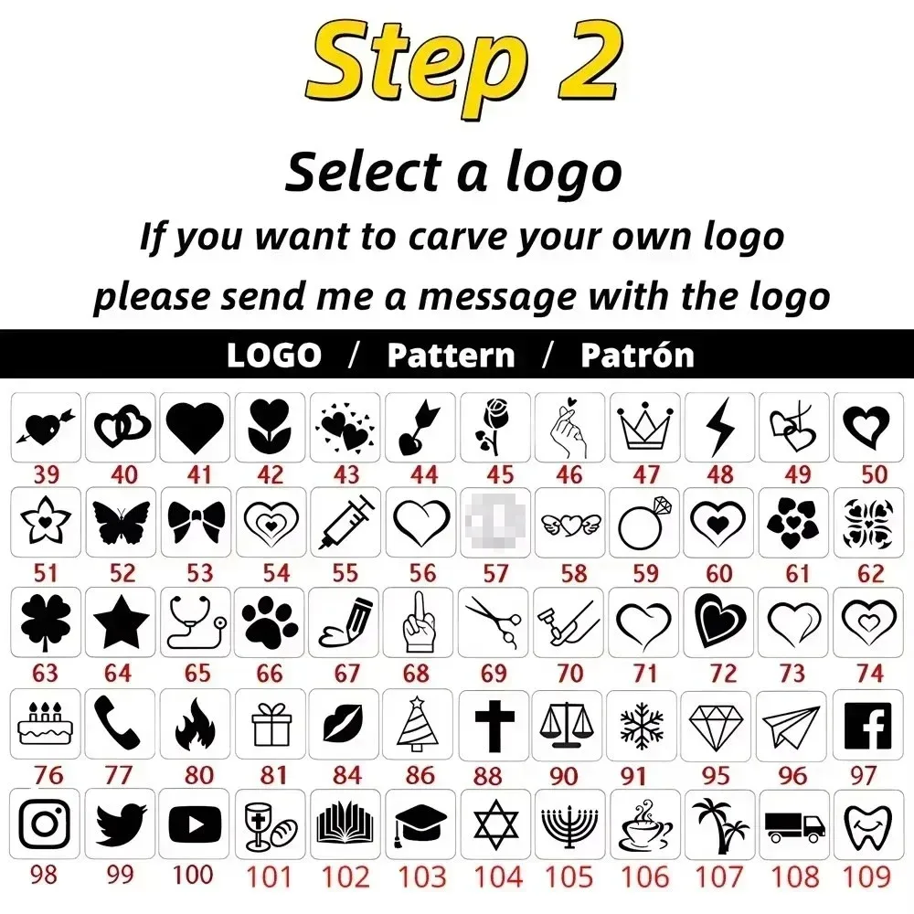 Passaggio 1: inviare il testo corrispondente alla penna. Passaggio 2: seleziona un carattere. Passaggio 3: seleziona uno schema. Passaggio 4: seleziona la posizione da scrivere. Dopo l’acquisto Per favore inviami il messaggio di testo che desideri incidere nel seguente formato: