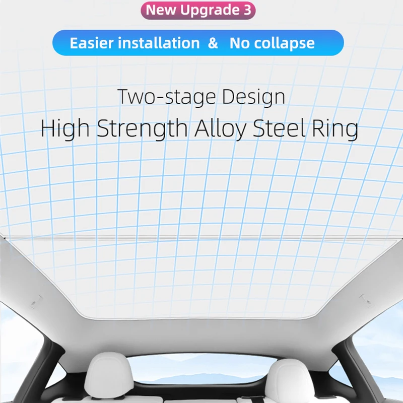 Il nuovo parasole per tetto in vetro di aggiornamento 2023 riduce la temperatura interna dell’auto riducendo la trasmissione del calore nella cabina che blocca due terzi di carico termico solare.