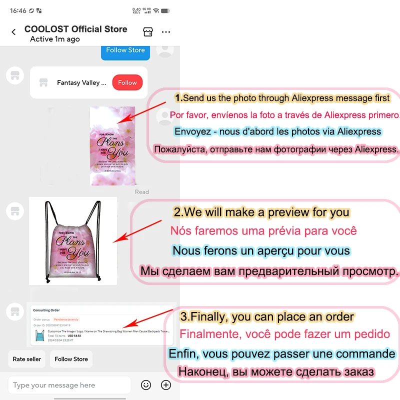 Step 1:You can send us the image through Aliexpress message or send it to our email . Step2:we will show you the preview of the bag with your picture soon after we receive your image. Step3: if you are satisfied with the preview ,you can make an order.