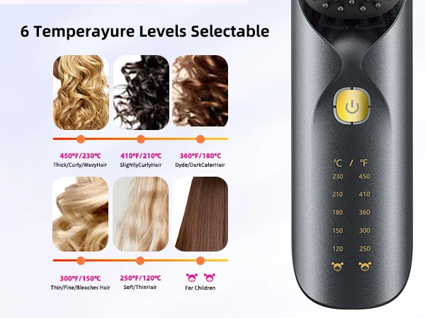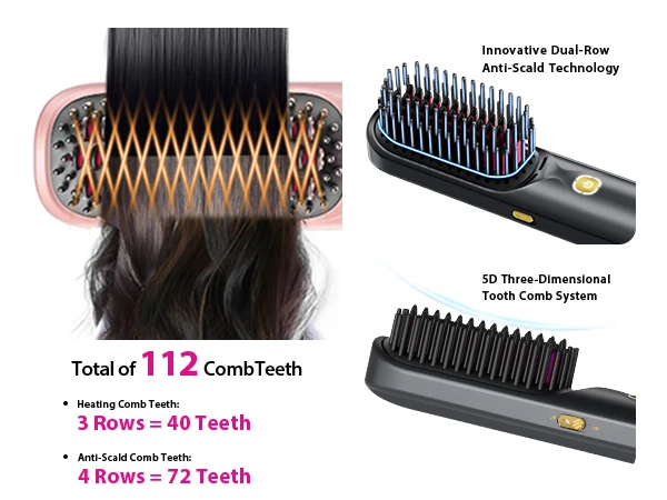 ▲ Spegnimento/Spegnimento automatico – Pause dopo 5 minuti, potenze di sconto a 10 minuti. Pettine a doppio strato: denti esterni resistenti al calore + strato interno rivestito in cheratina per la protezione del cuoio capelluto.