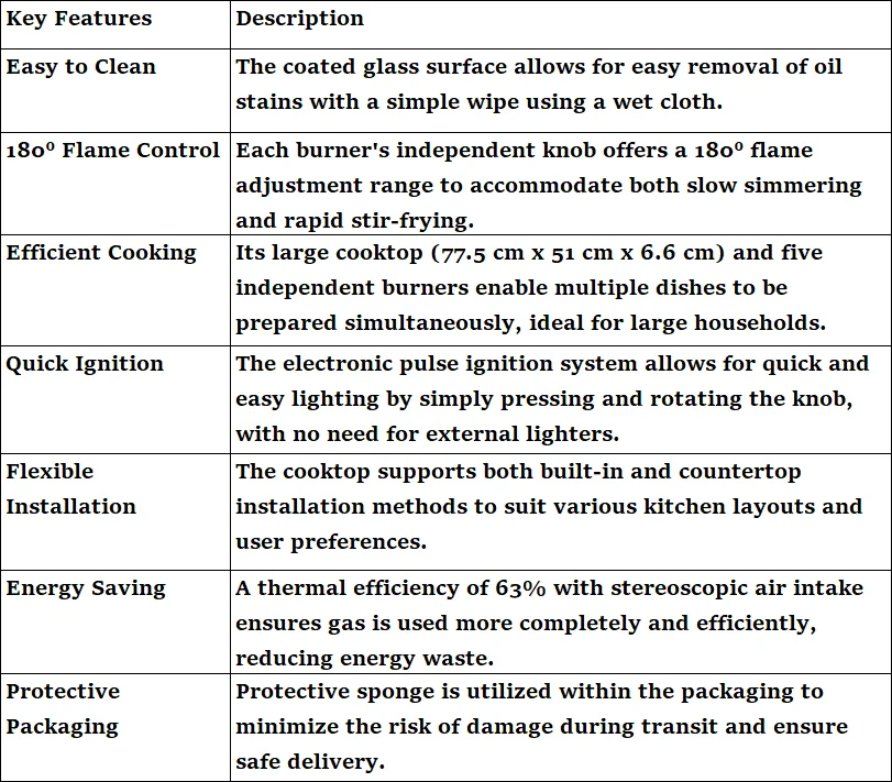 Sei ancora preoccuparti sulla cucina inefficiente?Questo piano cottura a gas con 5 fuochi cambierà completamente l’esperienza di cottura!Ha 5 fuochi con manopole di regolazione del fuoco indipendenti, quindi può cucinare più piatti contemporaneamente, rendendo facile da stirare, friggere lentamente stufato, vapore e friggere su un piano cottura.Si è per cucinare quotidianamente o riunioni di famiglia, puoi portare la comodità ad alta efficienza e risparmio energetico.