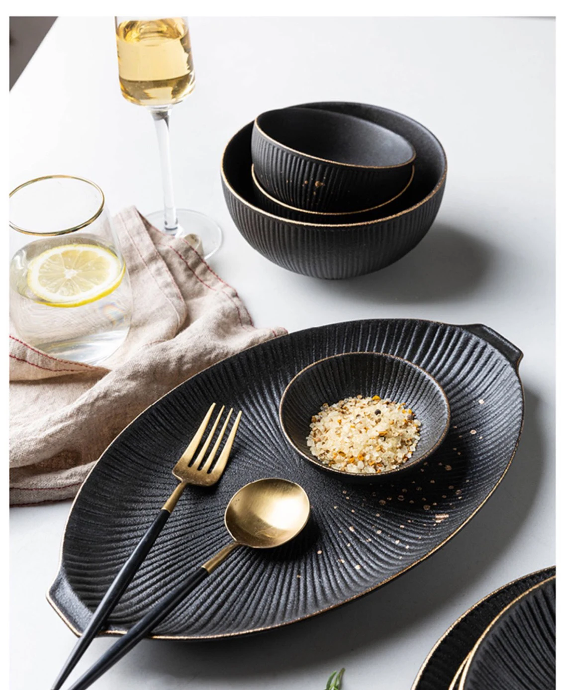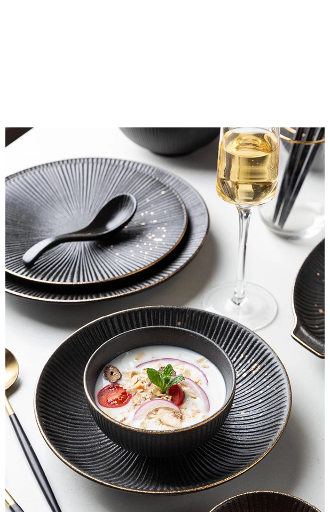 Piatto da pranzo in porcellana con bordo dorato di lusso Piatti in ceramica a strisce nere Set di stoviglie per la casa Ciotola del ristorante dell’hotel Nuovo