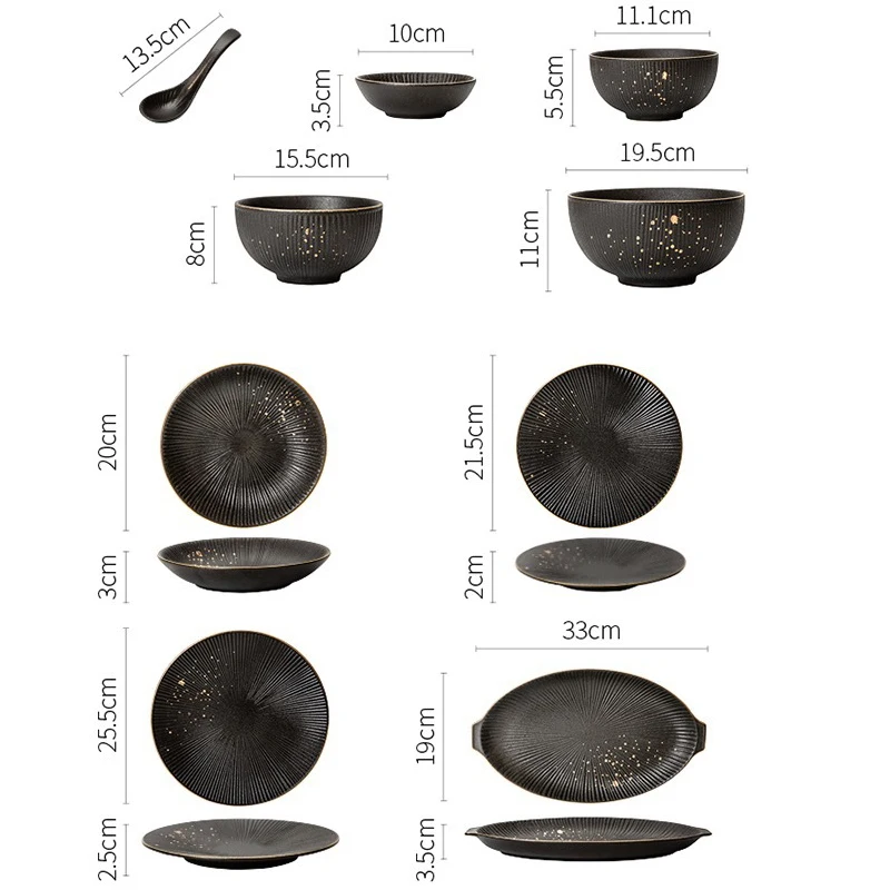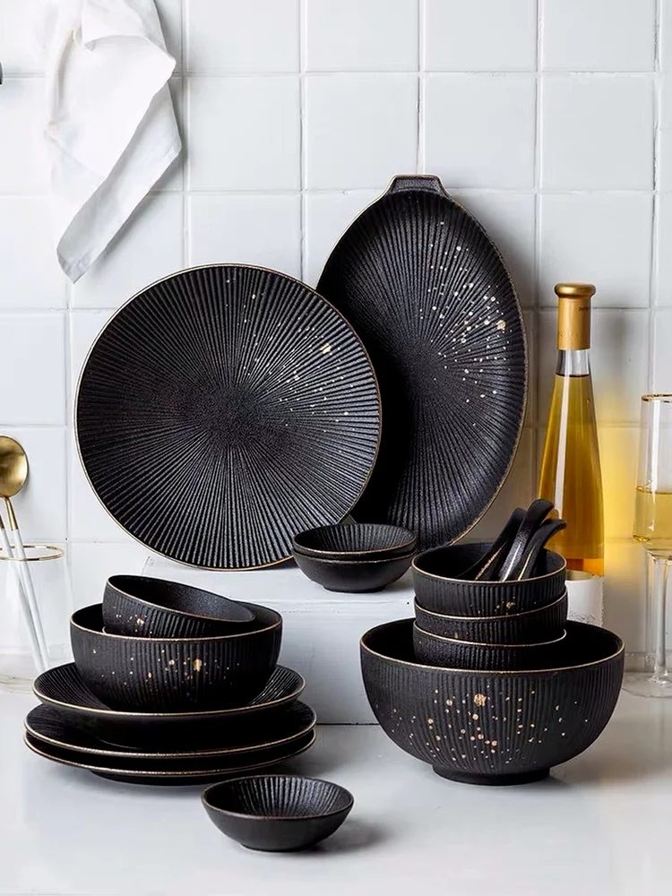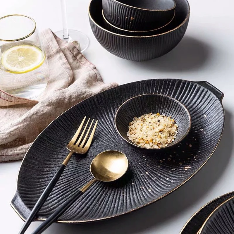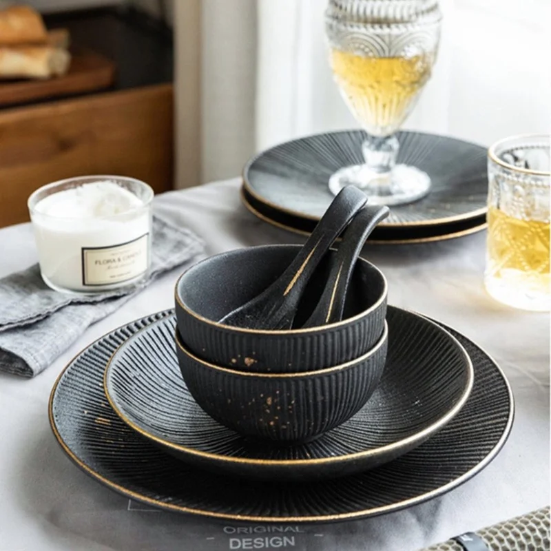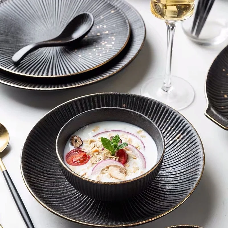 Piatto da pranzo in porcellana con bordo dorato di lusso Piatti in ceramica a strisce nere Set di stoviglie per la casa Ciotola del ristorante dell’hotel Nuovo
