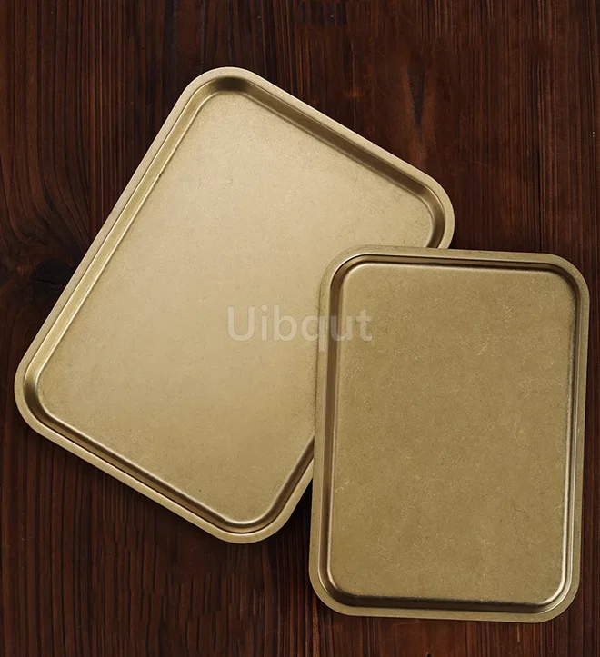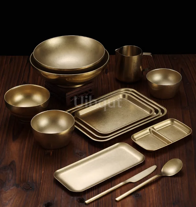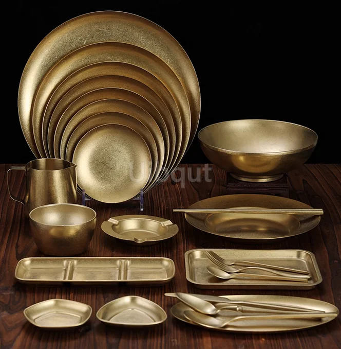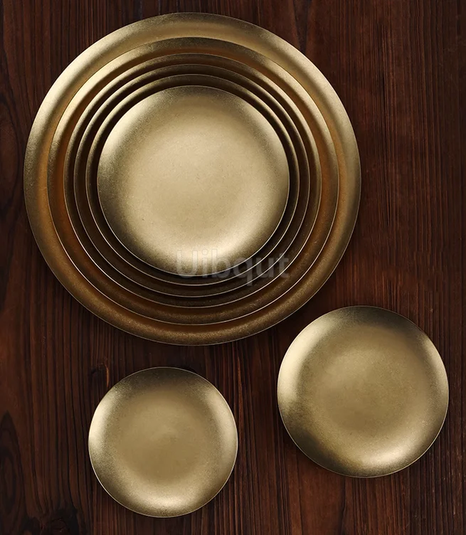 Piatto da pranzo rotondo rettangolare in metallo vintage dorato Piatto da dessert per patatine fritte da campeggio occidentale in acciaio inossidabile 1Piatto da pranzo rotondo rettangolare in metallo vintage dorato Piatto da dessert per patatine fritte da campeggio occidentale in acciaio inossidabile