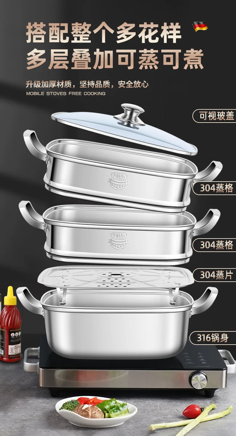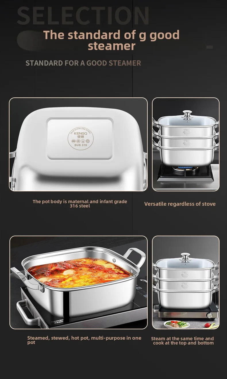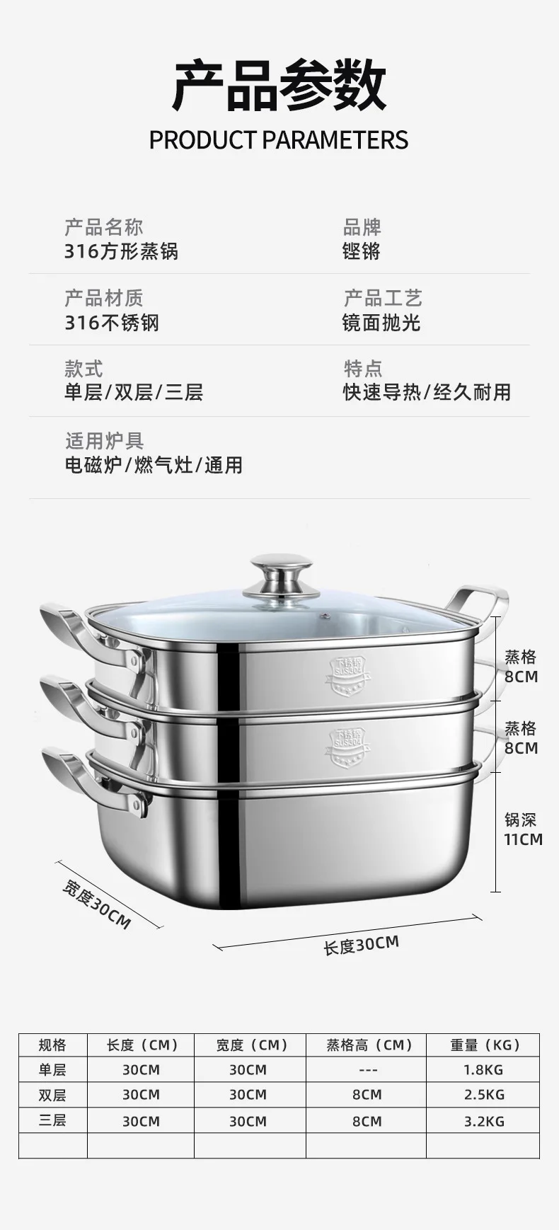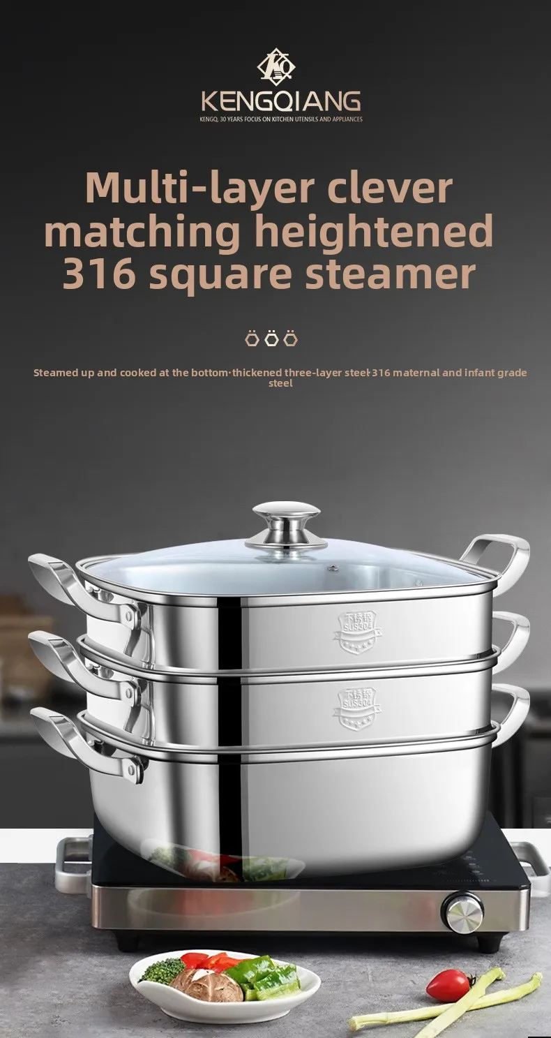 Piroscafo quadrato, uso domestico, cestello per cottura a vapore spesso in acciaio inossidabile 316, fornello a induzione a gas multifunzionale, universale