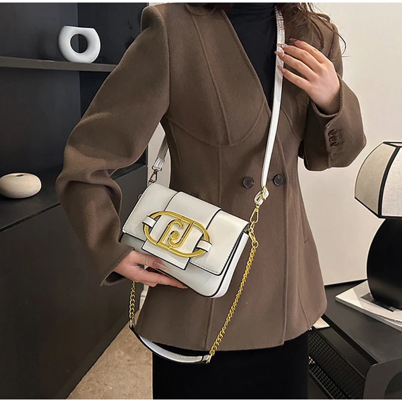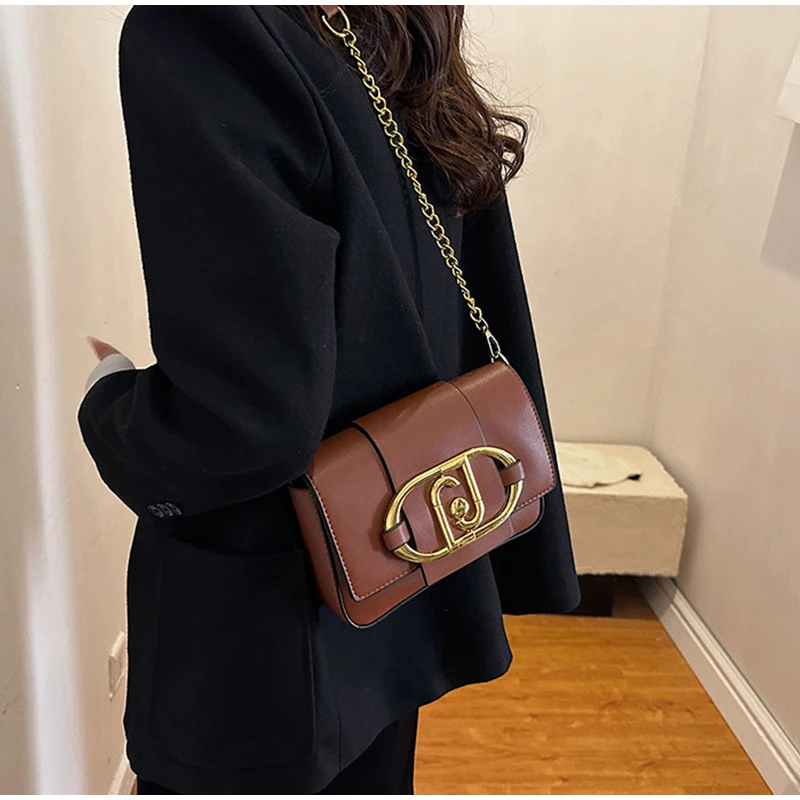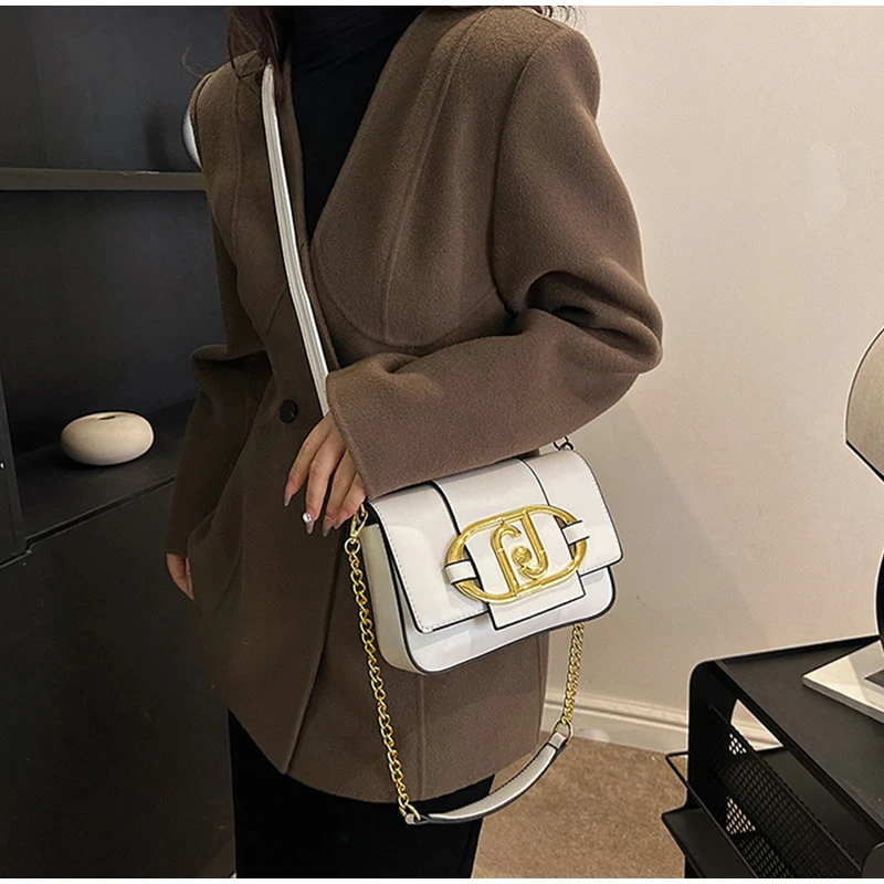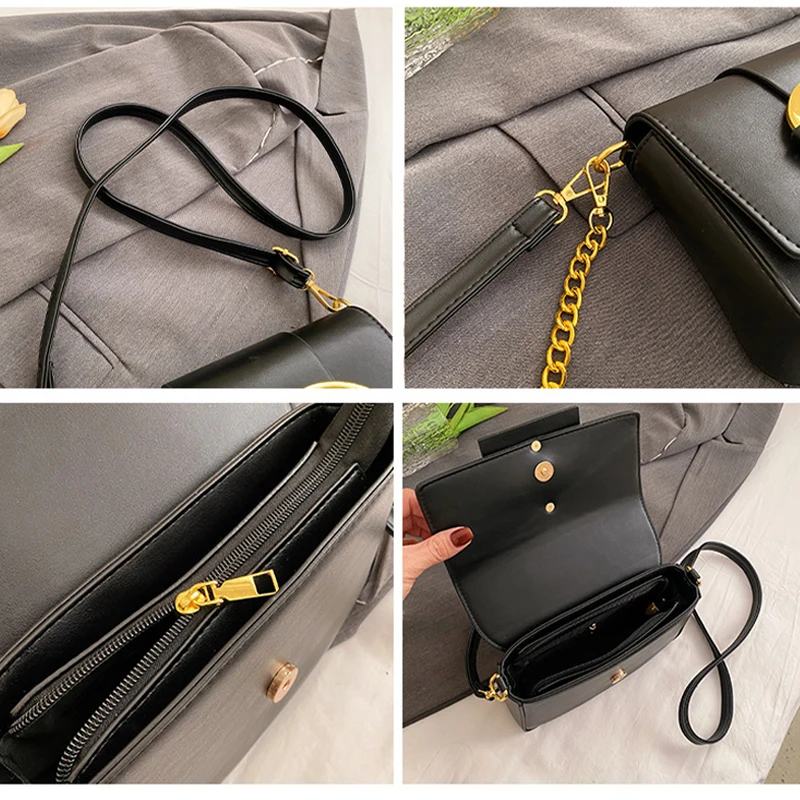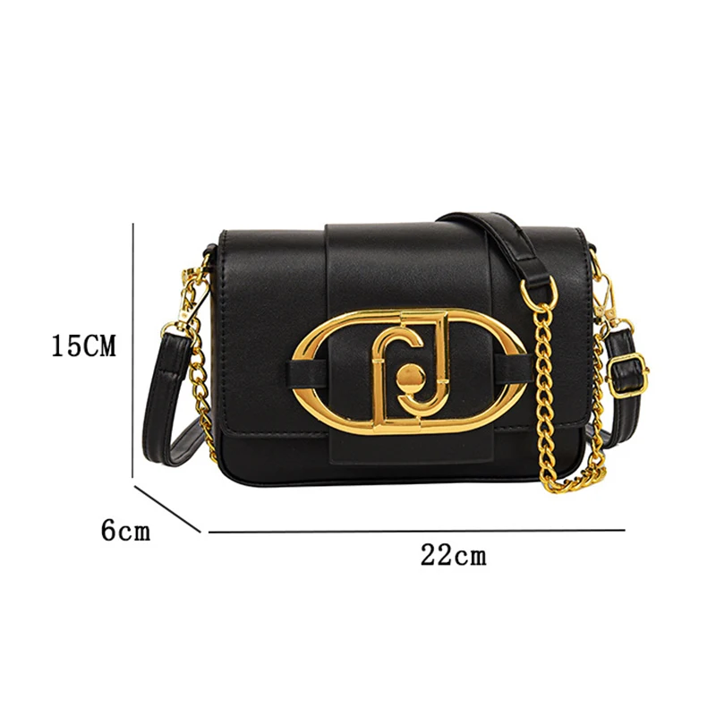 Pochette nera di lusso di fascia alta con patta in pelle, design a catena dorata, irresistibile, squisita borsa a tracolla attraente con fascino alla moda