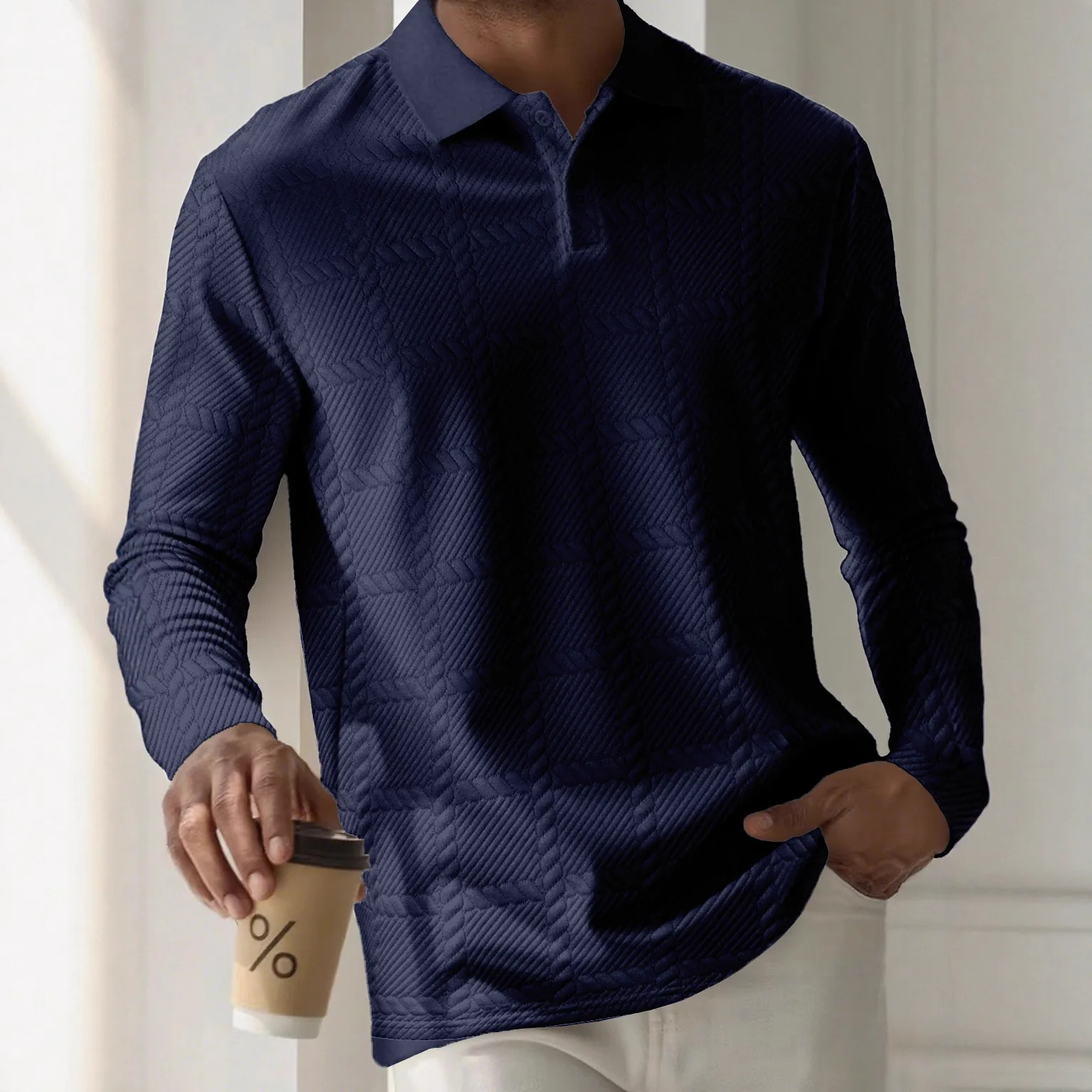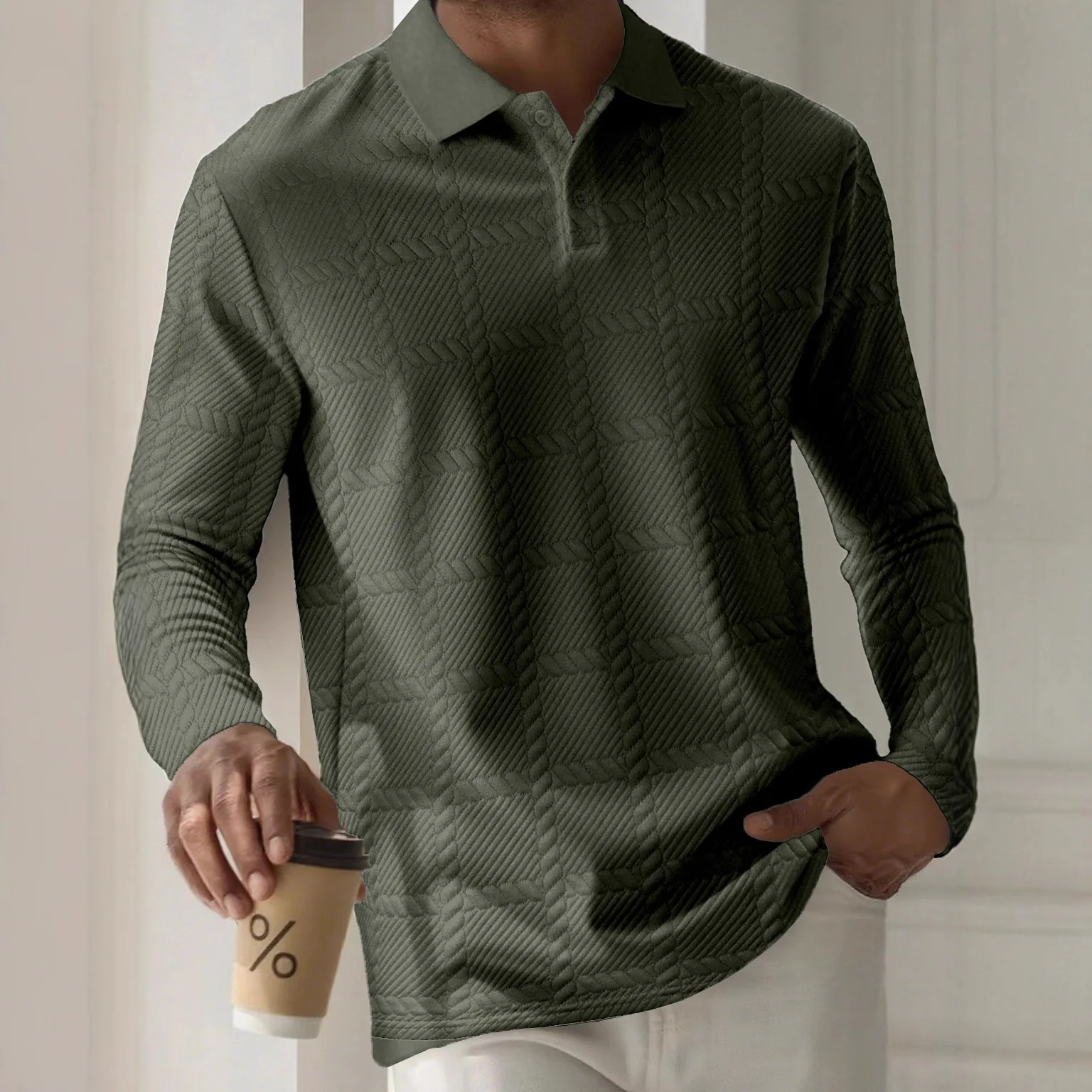 Polo da uomo invernale e autunnale con motivo a quadri, tinta unita alla moda, colletto casual, chiusura con bottoni, top a maniche lunghe