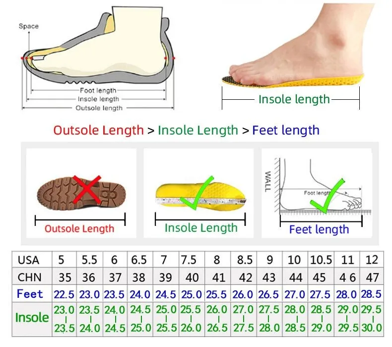 Come scegliere la dimensione corretta: primo supporto sui piedi saldamente sul pavimento per misurare la parte più lunga, utilizzare quindi i dati della lunghezza del piede per trovare le dimensioni delle scarpe corrispondenti sul tavolo di dimensioni inferiori. 1. Lunghezza del piede nella tabella delle dimensioni significa utilizzare questa lunghezza del piede per scegliere il sizche corretto corrispondente sarà adatto. Lunghezza del piede non sottopiede lunghezza non suola lunghezza. 2. Si prega di scegliere in base alla lunghezza del piede, (non scegliere le dimensioni in base alle dimensioni delle scarpe normali!!) 3. a causa di diversi angoli di visualizzazione e tiro, potrebbe essere una piccola differenza di colore da quello reale.