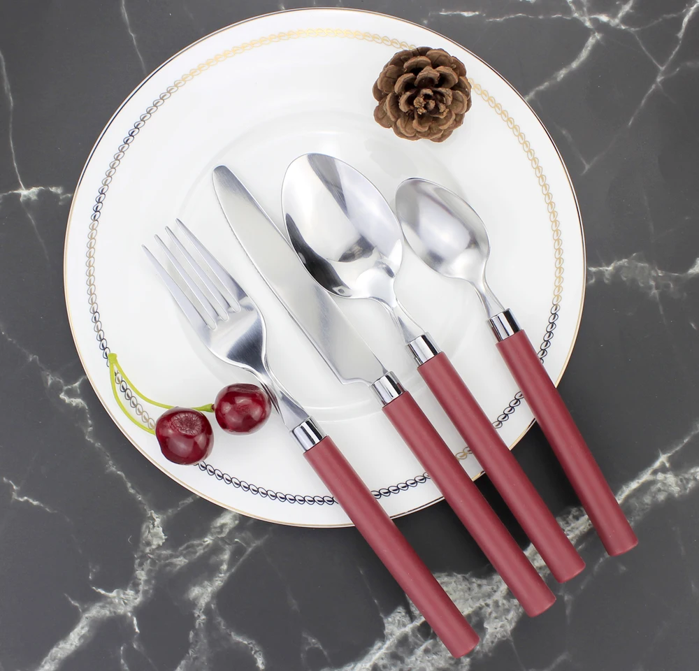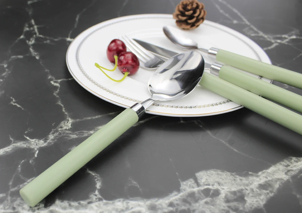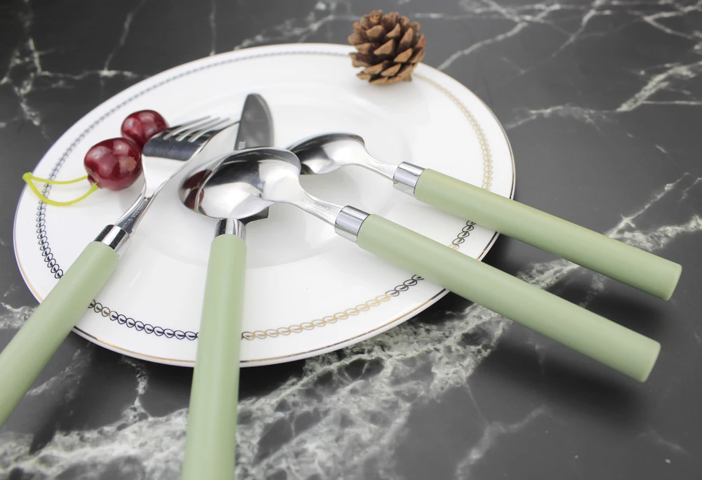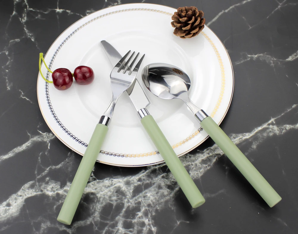 Posate colorate a portata di mano 4 In 1 Set manico In plastica specchio coltello In acciaio inossidabile forchetta cucchiaio posate ecologiche per mensa domestica