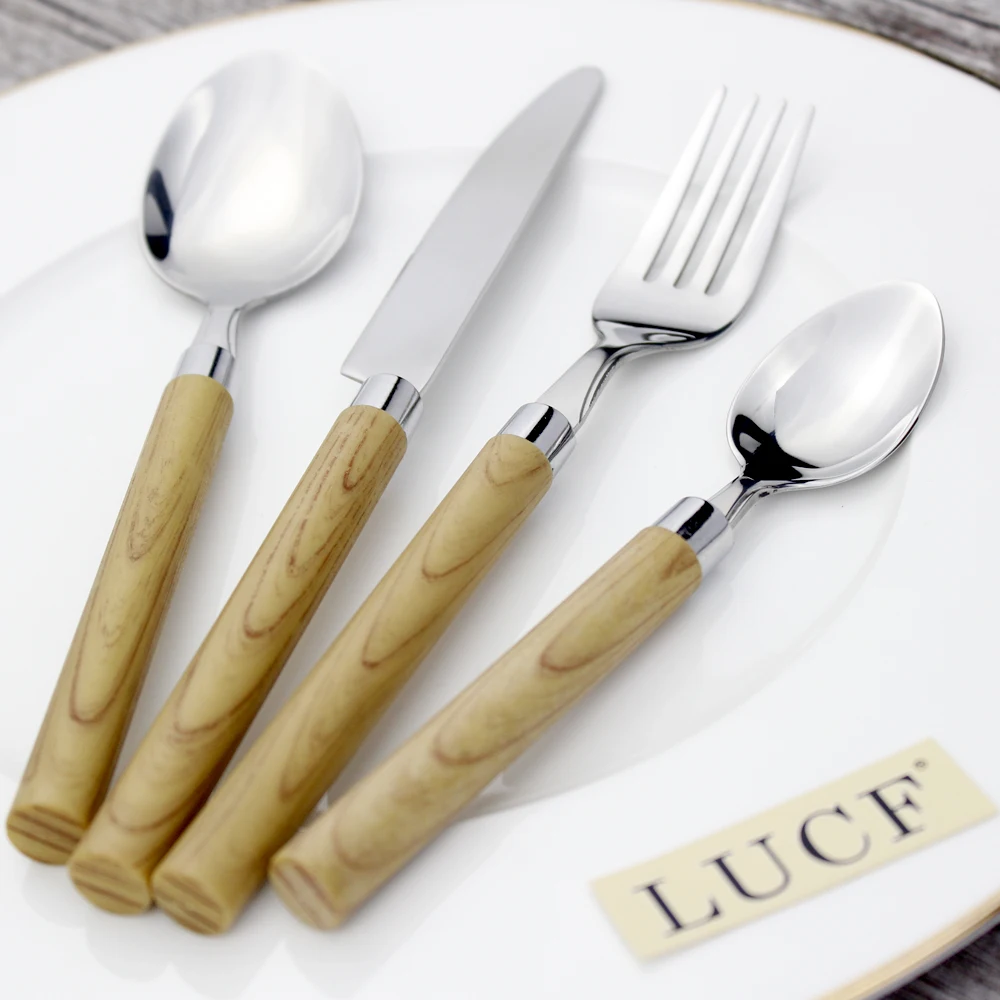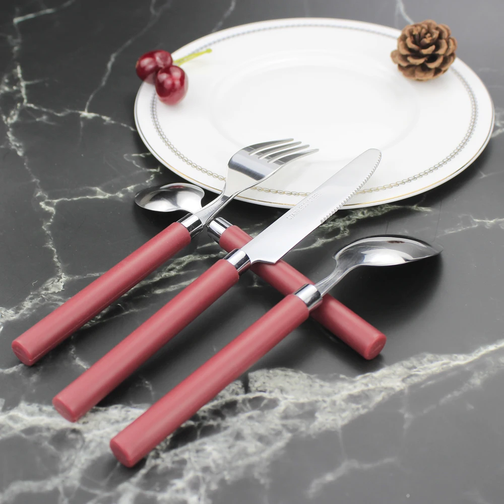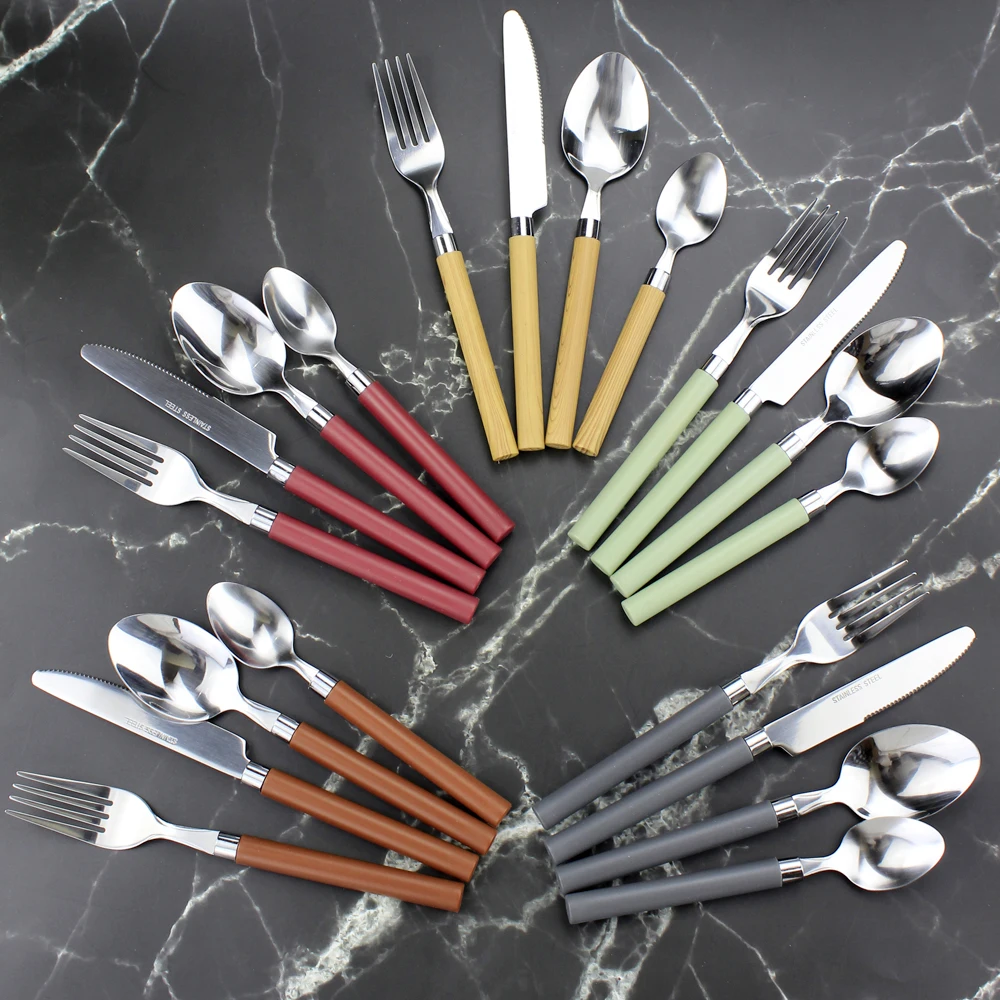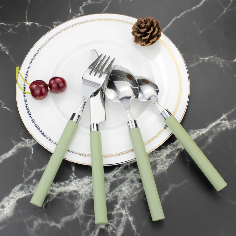 Posate colorate a portata di mano 4 In 1 Set manico In plastica specchio coltello In acciaio inossidabile forchetta cucchiaio posate ecologiche per mensa domestica