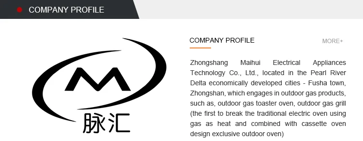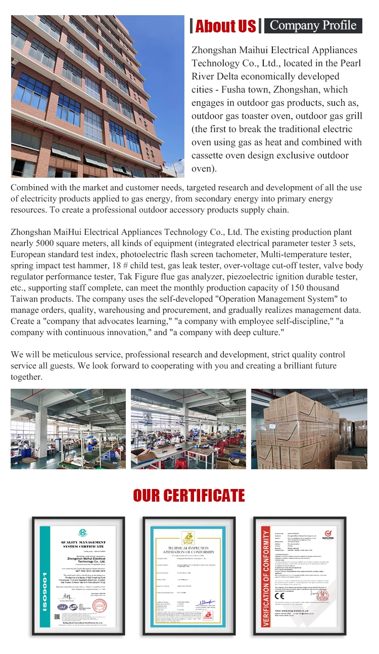 Q1. Sei una fabbrica? A1,Sì, siamo una fabbrica. Abbiamo una ricca esperienza nell’industria Q2. Ciò che sono i tuoi prodotti principali? A2,Maihui è un servizio professionale per esterni a gas, tostapane a gas, fornello multiuso a gas, fornello a gas, fornello portatile a gas e altri piccoli elettrodomestici a gas diversificati ricerca e sviluppo, produzione e vendita come una delle imprese. Q3. Ciò che è la tua capacità di produzione? A3, possiamo produrre circa 400.000 pezzi all’anno. Q4. Fornire servizi ODM e OEM? A4, ciao, forniamo ODM/OEM, SKD e altri servizi Q5. Vendi pezzi di ricambio? A5, sì, vendiamo anche i pezzi di ricambio. Q6. Come lungo è la tua garanzia? A6, Un anno di garanzia, un anno di qualsiasi problema parti di ricambio gratuite Q7. Ciò che è la quantità dell’ordine minimo? A7, Guarda il prodotto, la quantità dell’ordine minimo di prodotti diversi non sono uguali, di solito siamo un cartone all’ingrosso. Q8. Ciò che è il tuo tempo di consegna? A8,Deposito del prodotto e della quantità, il tempo di consegna dei diversi prodotti sono diversi, circa 5-30 giorni Q9. Come sui termini di pagamento? A9,T/T o L/C in vista.