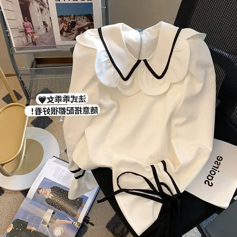 Primavera Autunno Tendenza Contrasto Allacciatura Patchwork Camicetta coreana Manica lunga Camicia elegante allentata Top Moda coreana Abbigliamento donna
