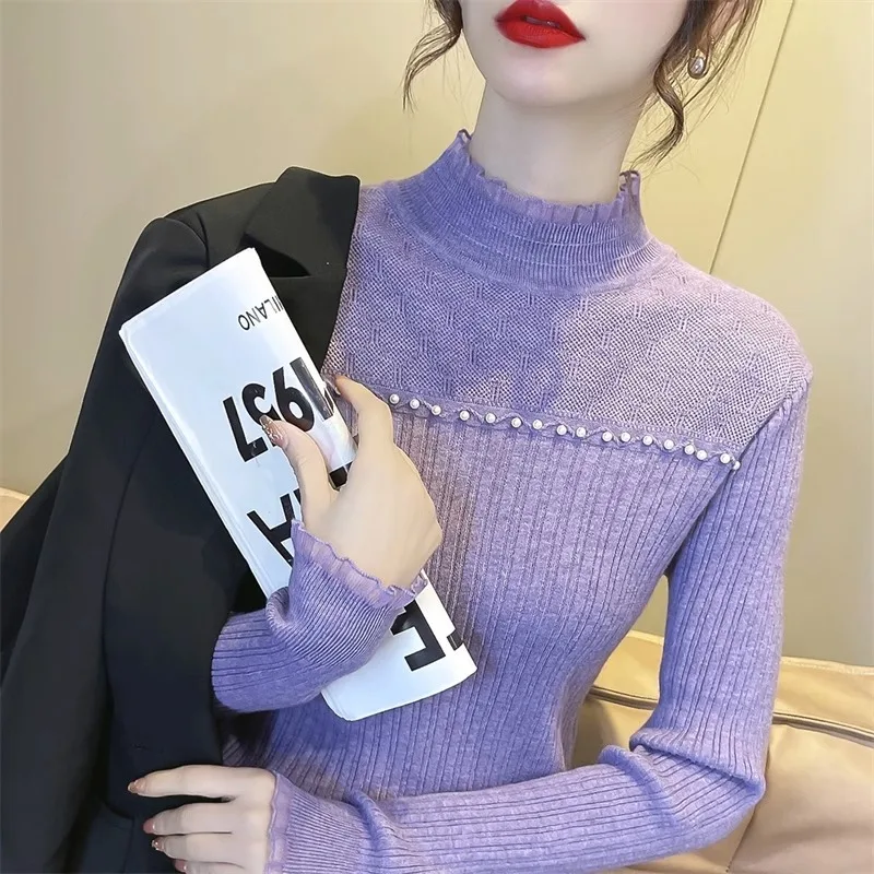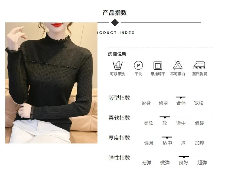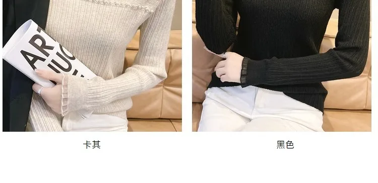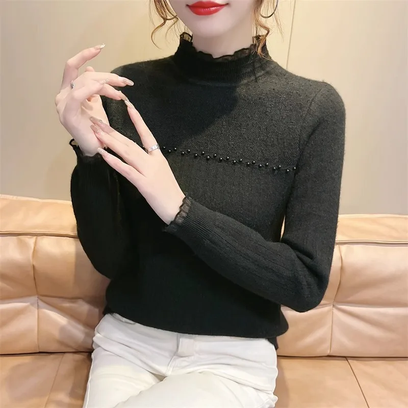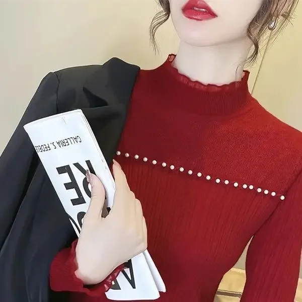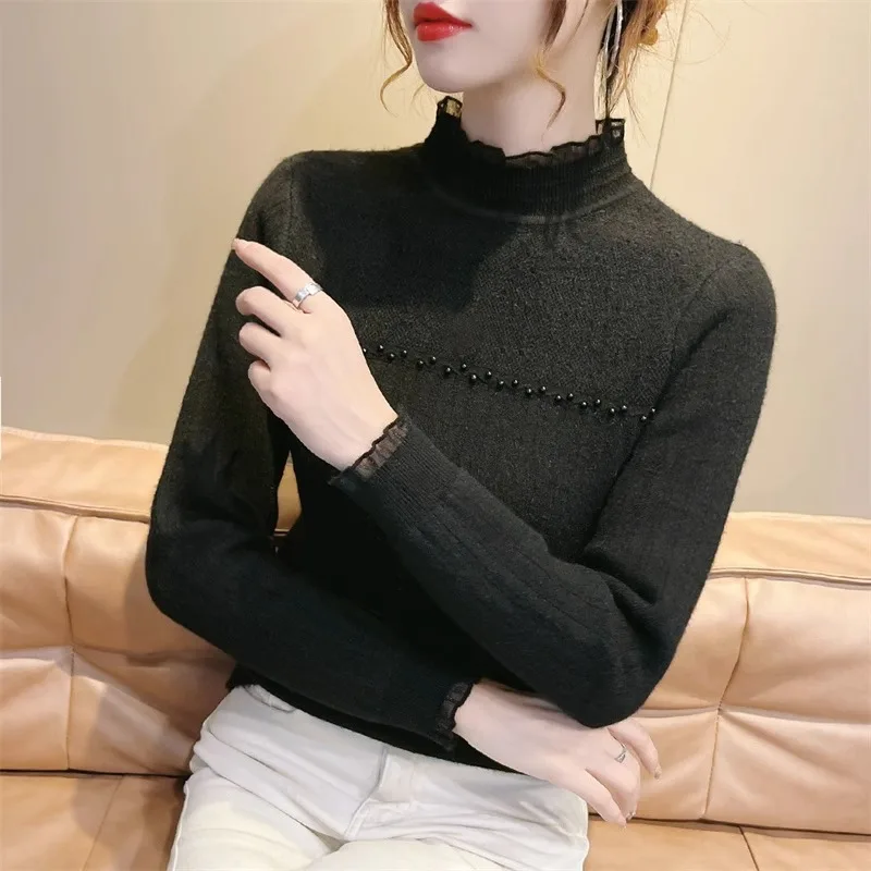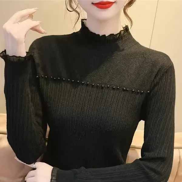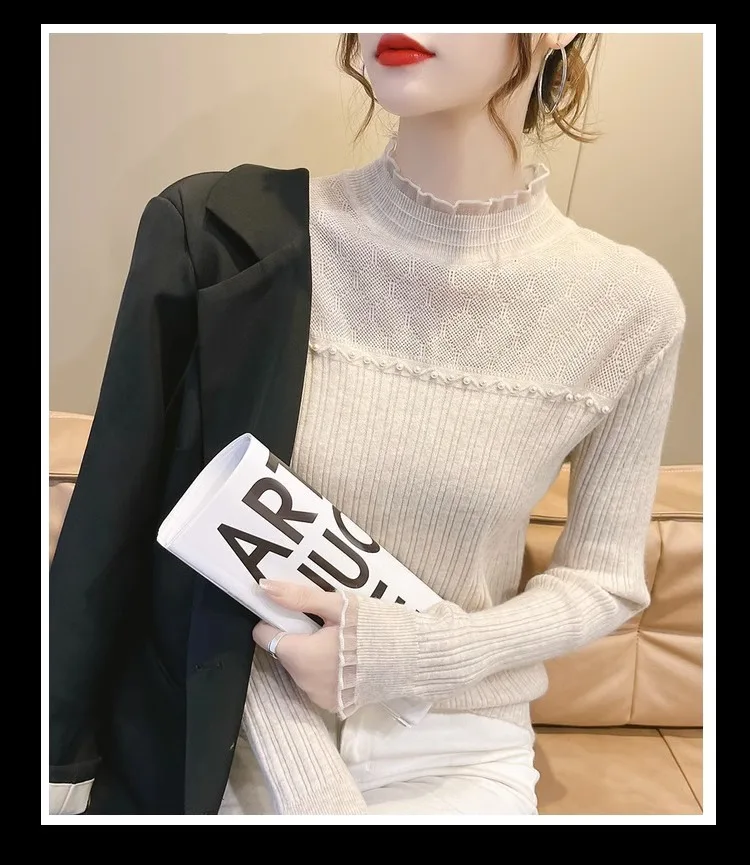 Primavera Autunno Vendita calda della stagione Camicia da donna dolce versatile slim fit con base in pizzo Mezza collo alto Top lavorato a maglia Abbigliamento interno Fa