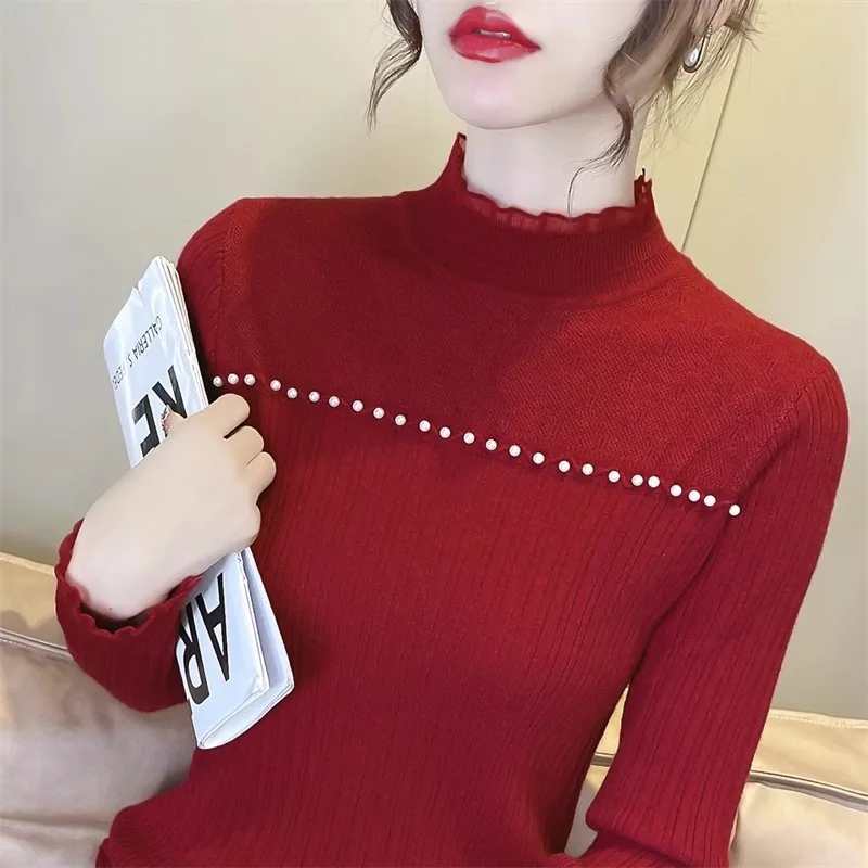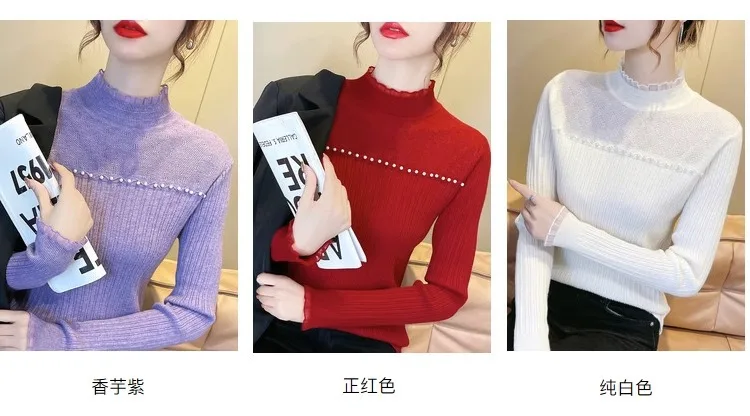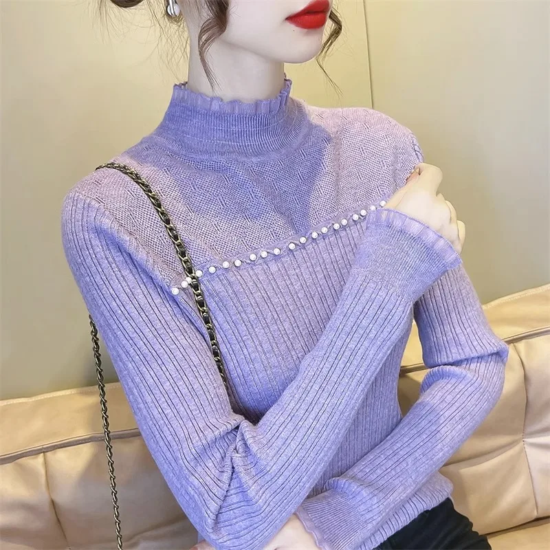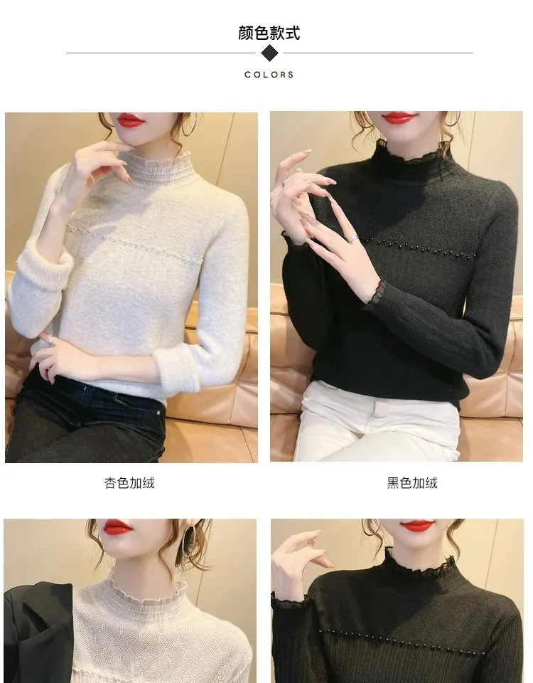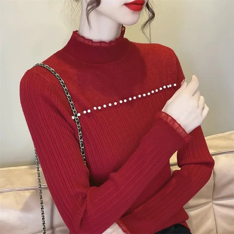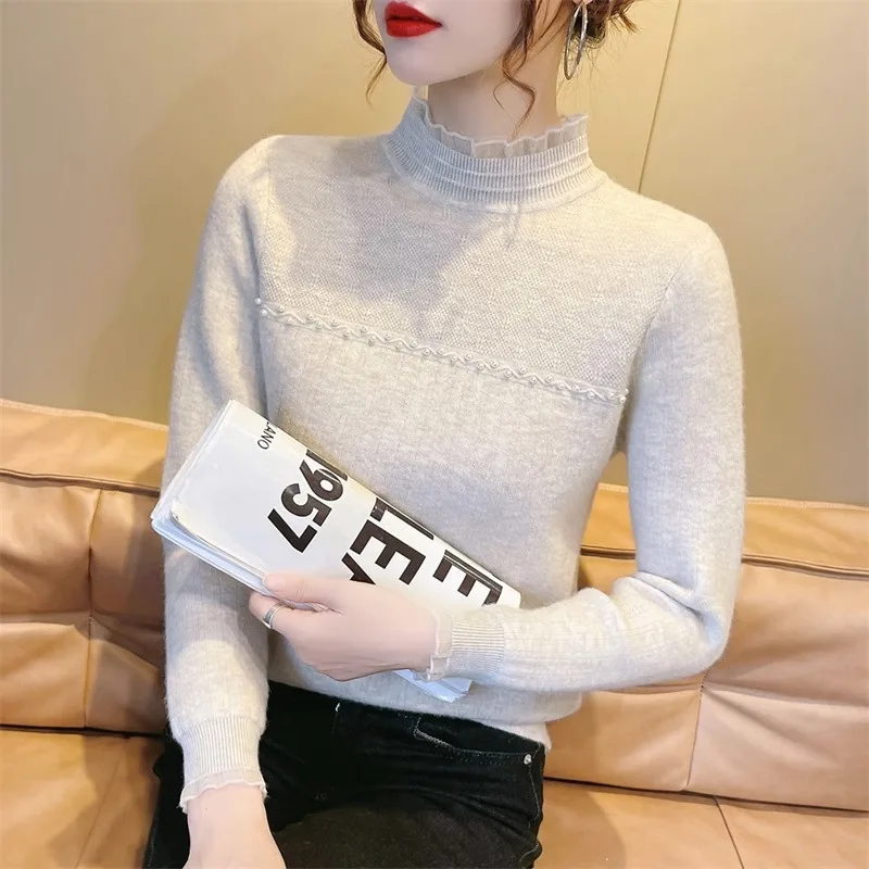 Primavera Autunno Vendita calda della stagione Camicia da donna dolce versatile slim fit con base in pizzo Mezza collo alto Top lavorato a maglia Abbigliamento interno Fa