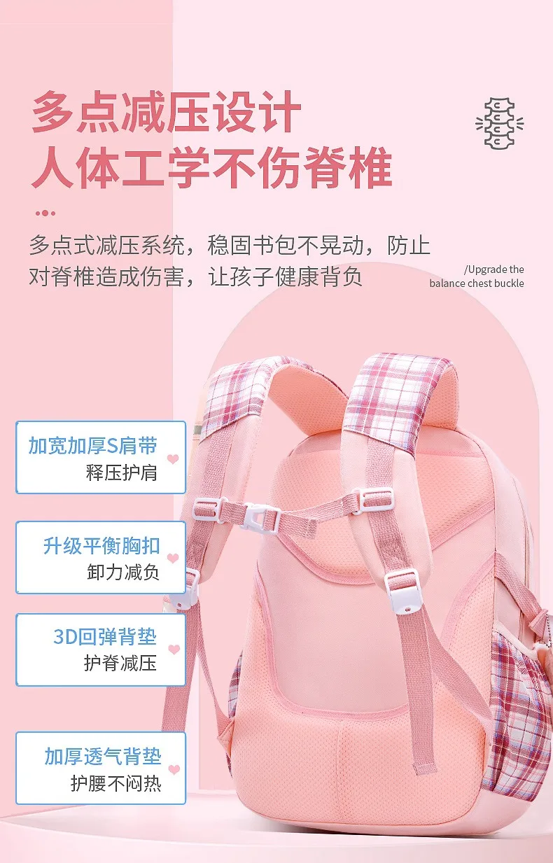 Proteggi la ergonomia della colonna vertebrale Studenti delle scuole elementari Zaino a quadretti per ragazze Grande capacità Leggero impermeabile