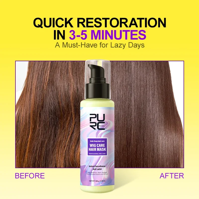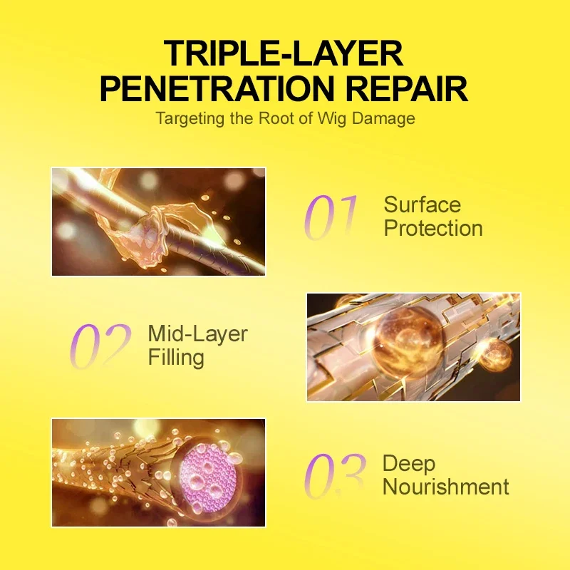 Specially designed for wig care, it contains deep hair care ingredients such as collagen and argan oil, which penetrate the hair layer by layer, restoredamaged fibers, improve dryness and roughness of hair, give the wig an instant smooth and shiny feeling, enhance elasticity and softness, and is suitable for various materials of wigs.