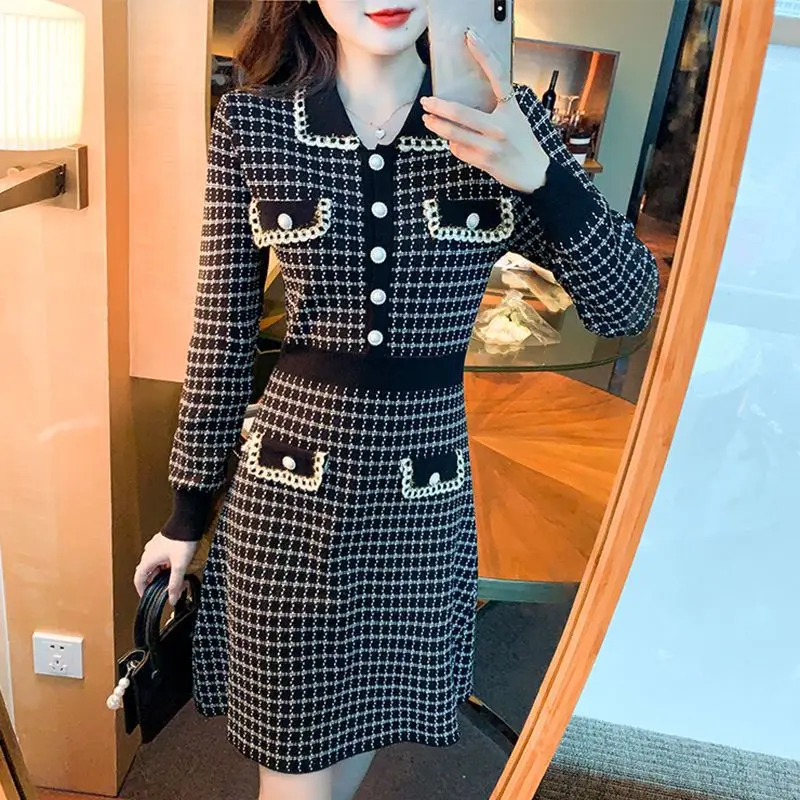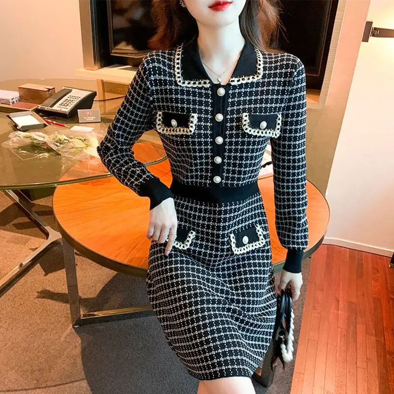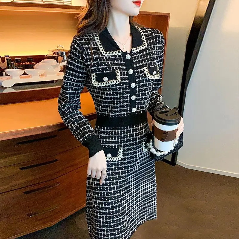 Qiandongge Abito lavorato a maglia da donna 2025 Autunno e inverno Temperamento di Capodanno Gonna maglione stile straniero francese
