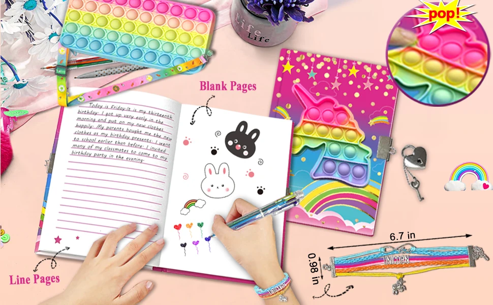 Quaderno pop per bambini, set Fidget Journal include diario con lucchetto Bracciale moda rosa 6 penne a sfera multicolori e astuccio pop