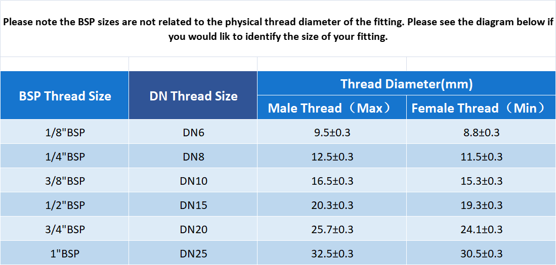 Si prega di notare che le taglie BSP non sono legate al diametro filettato fisico del raccordo. Si prega di vedere lo schema sotto se vuoi identificare la dimensione del tuo raccordo.