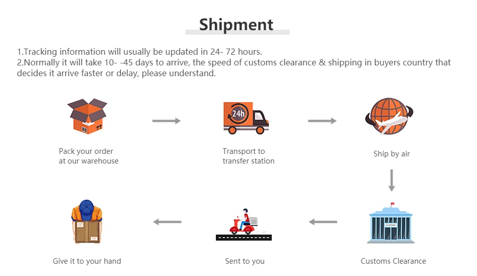 L’articolo viene spedito entro 3-7 giorni lavorativi una volta saldato il pagamento completo. Se non riesci a ricevere i tuoi articoli in tempo, per favore contattaci prima di noi, lo verificiamo e lo risolvi presto per te. Daremo una risposta alla tua posta entro 48 ore normalmente. A volte ha un piccolo ritardo a causa del fine settimana o delle vacanze.