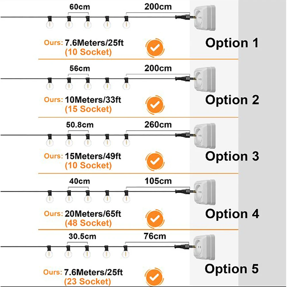Opzione 3: 15 metri String Light con 25 prese, Ti daramo una lampadina di ricambio extra.