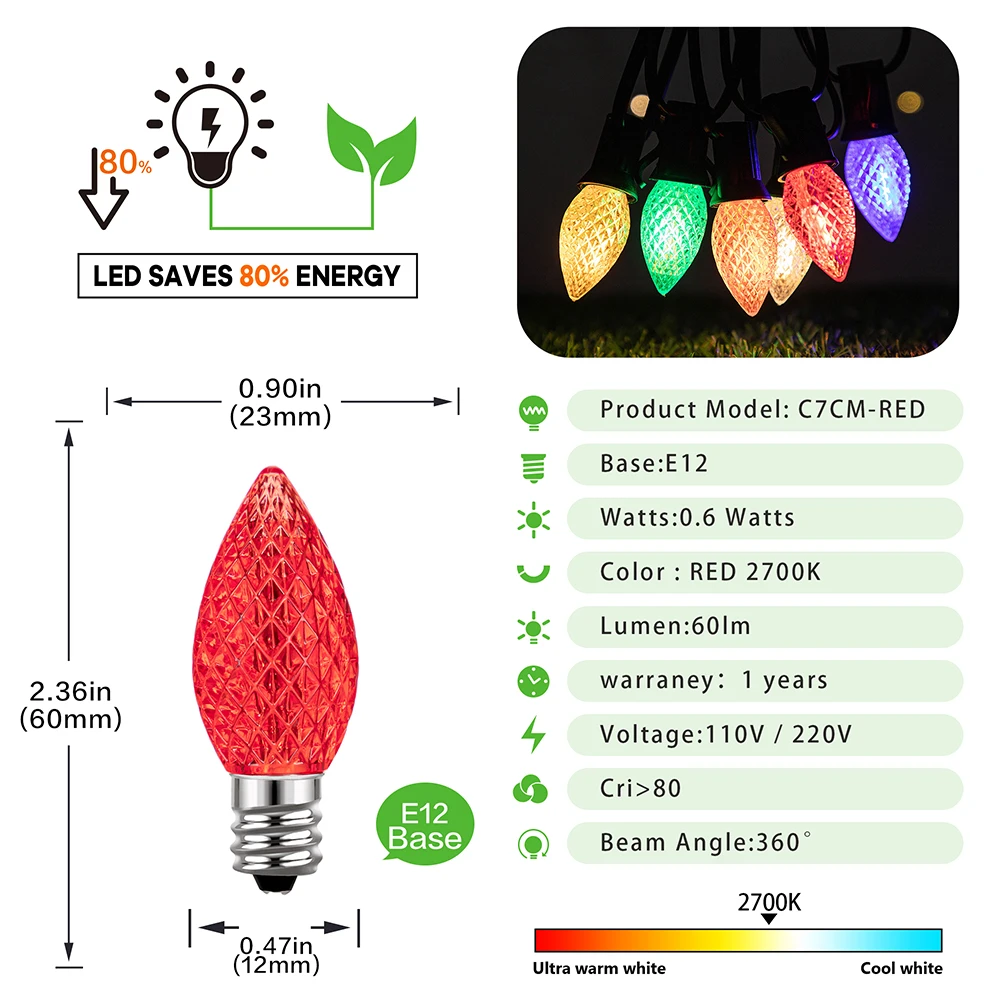 7.6M/ 10M/ 15M/ 20M RGB Luce colorata della stringa C7 Lampadina a led in plastica 0.6W Spina UE USA collegabile Ghirlanda impermeabile Luce Albero di Natale Decor Giardino