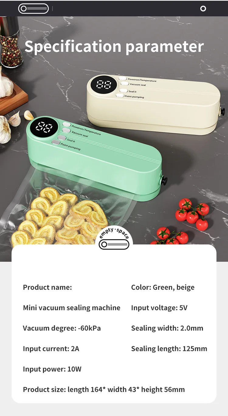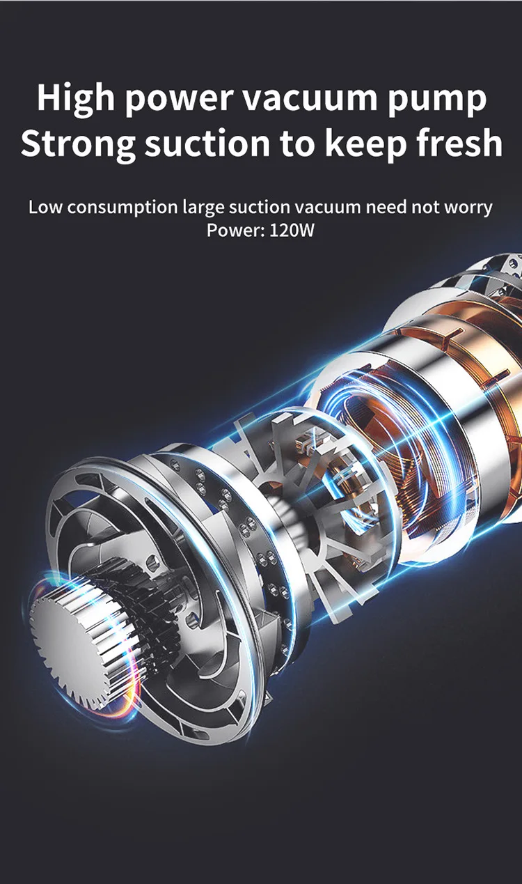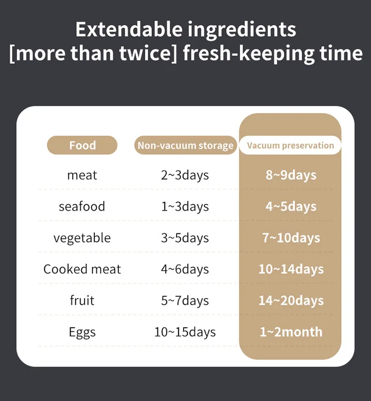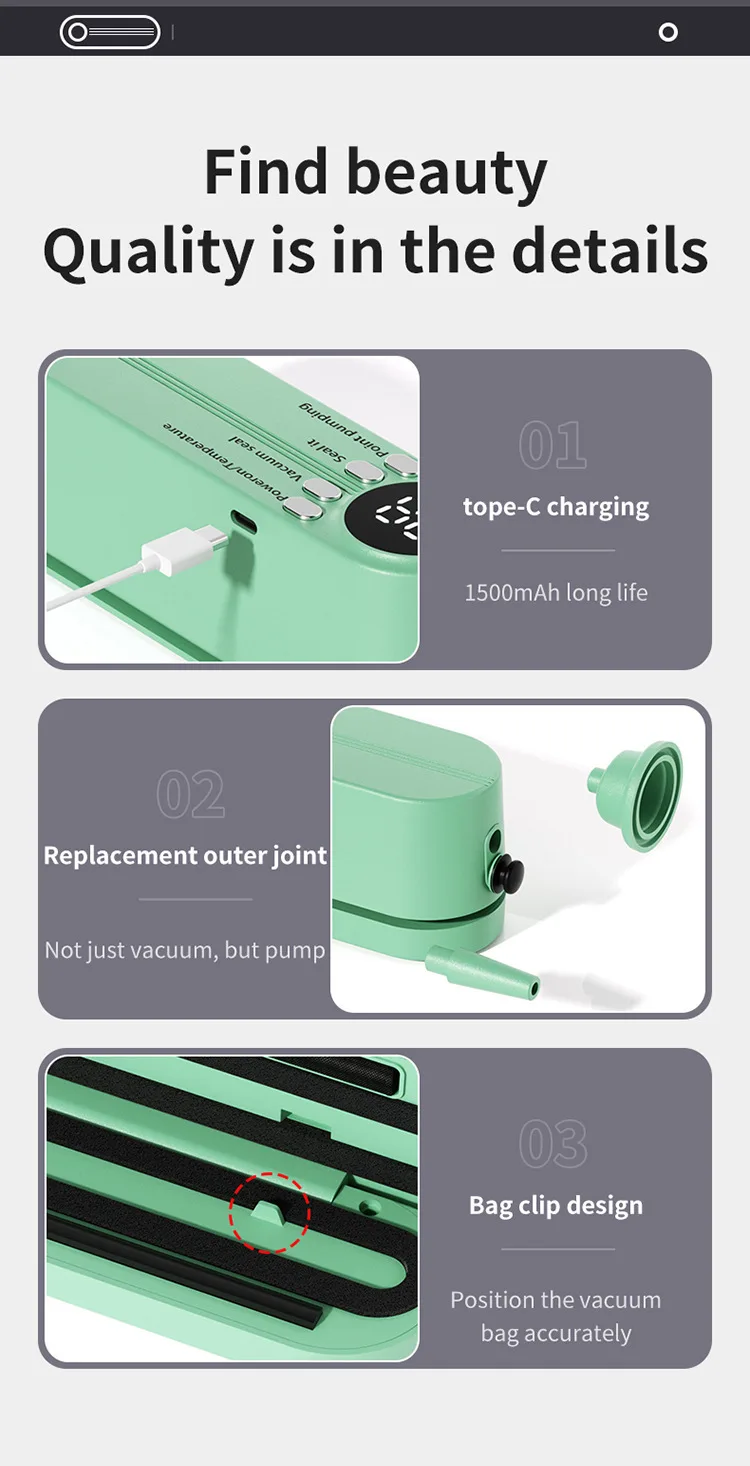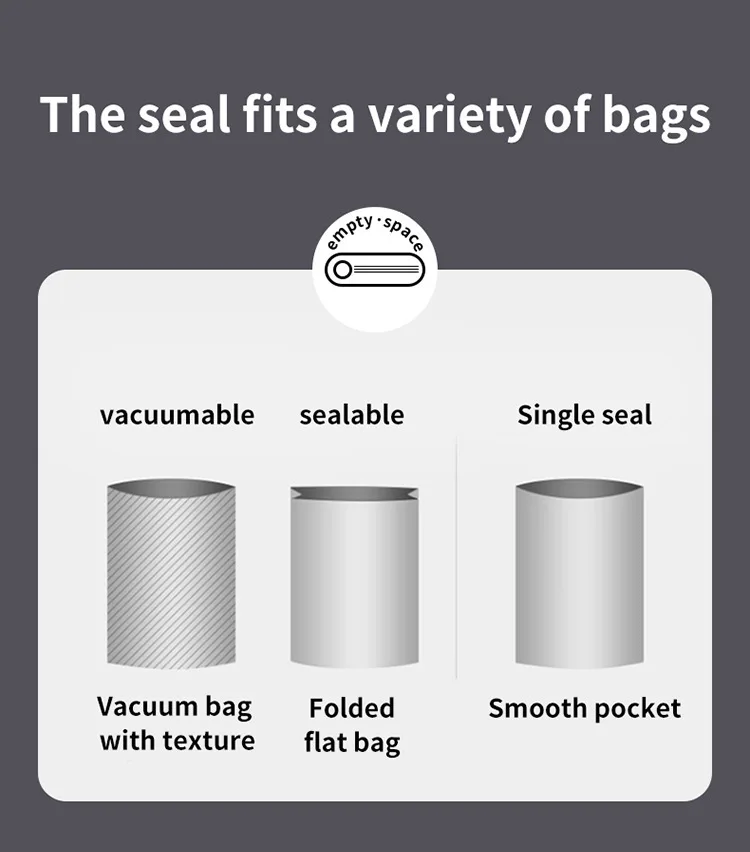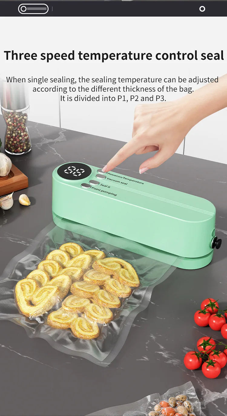 Scegli tra varie modalità di sigillatura per adattarle ai diversi tipi di cibo.La modalità di sigillatura automatica sottovuoto con un clic è ideale per carne, noci e verdure, mentre la modalità "Seal" è perfetta per sacchetti di patatine o sacchetti di foglio di alluminio.Il metodo "Pompa spot" consente l’aspirazione e la sigillatura autocontrollata, rendendola adatta per cibi morbidi o umidi.