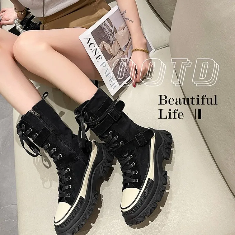 Rock Shoes Donna Designer di lusso Stivali con tacco piatto-Donna Punta tonda Moda 2024 Donna Autunno Med Caviglia Slip-On Tessuto di cotone