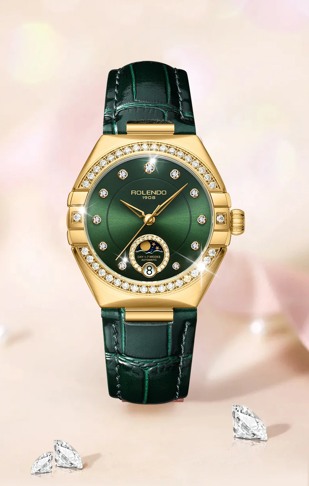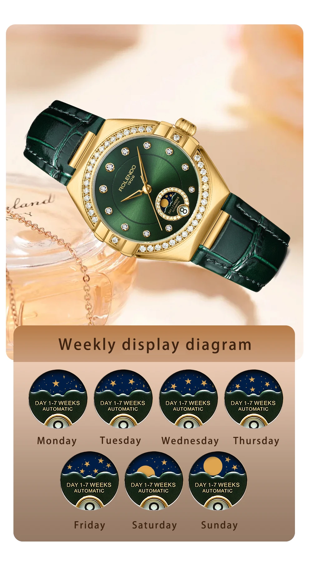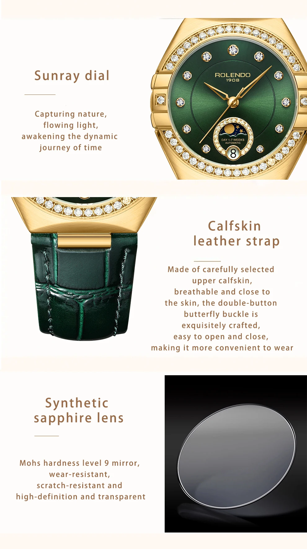 Marca: ROLENDO Modello: RL7105 Movimento: movimento meccanico completamente automatico Cinturino: pelle di vitello importata italiana Specchio: vetro zaffiro sintetico Chiusura: fibbia a farfalla a doppia pressione Diametro cassa: 33,0 mm Spessore cassa: 12,0 mm Larghezza cinturino: 20,0 mm Lunghezza cinturino: 18,0 cm Peso: 62,5 g Resistenza all’acqua: impermeabile fino a 30 metri di profondità