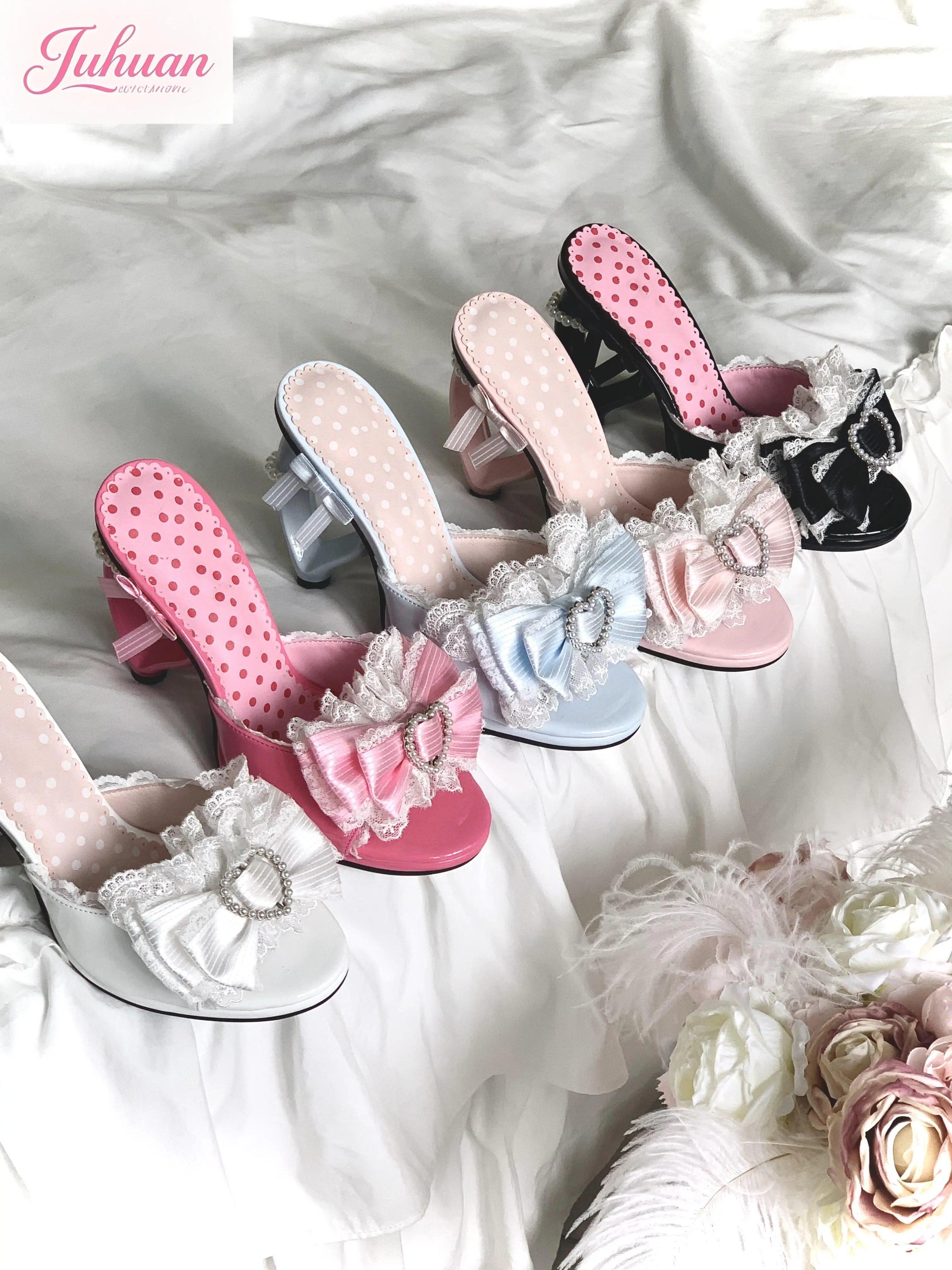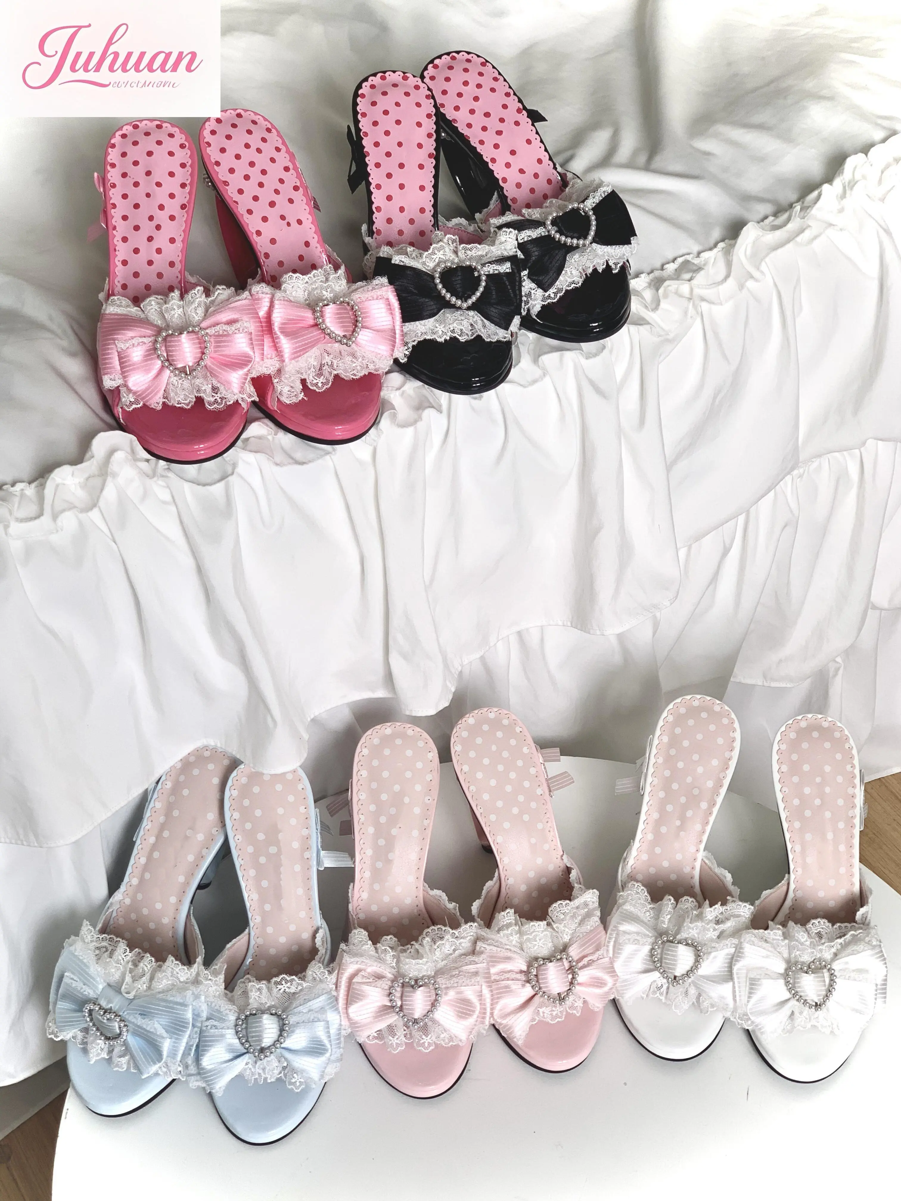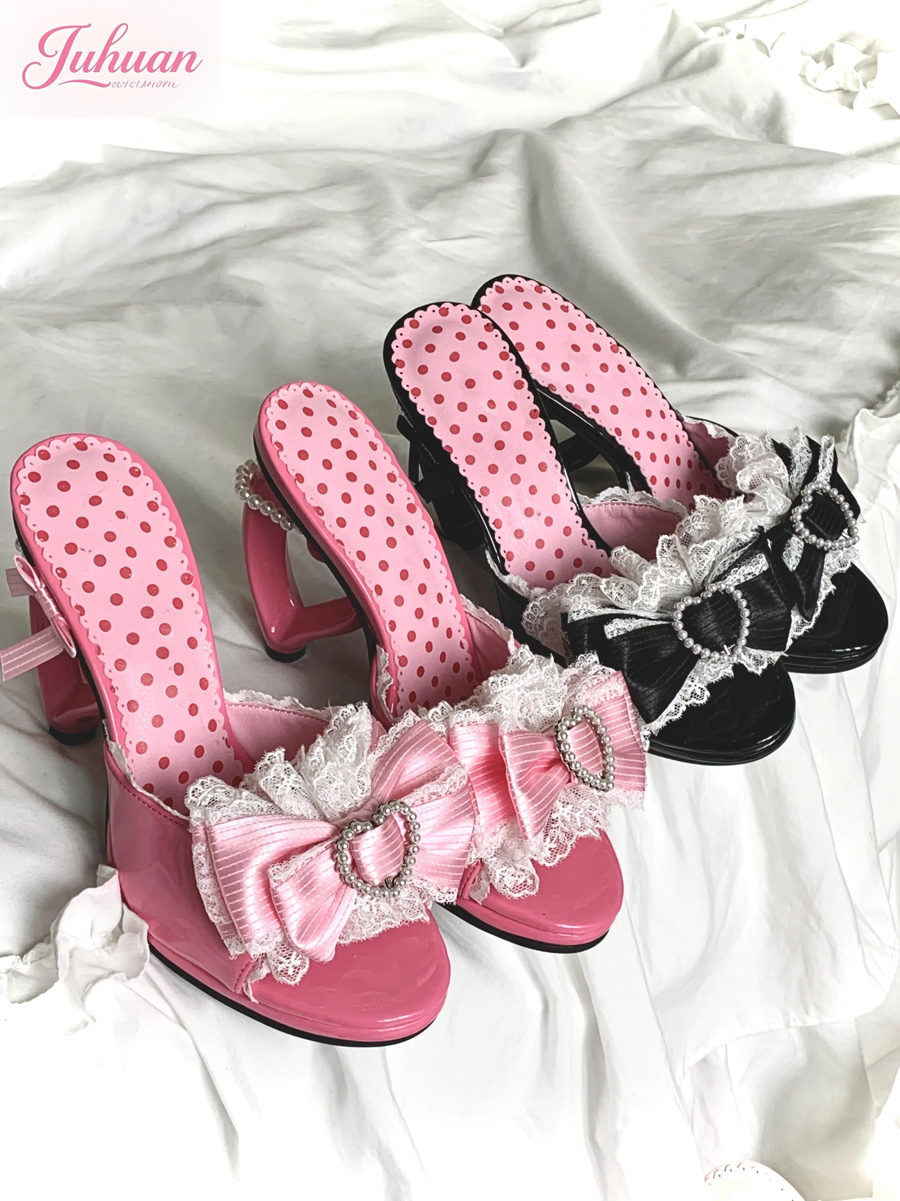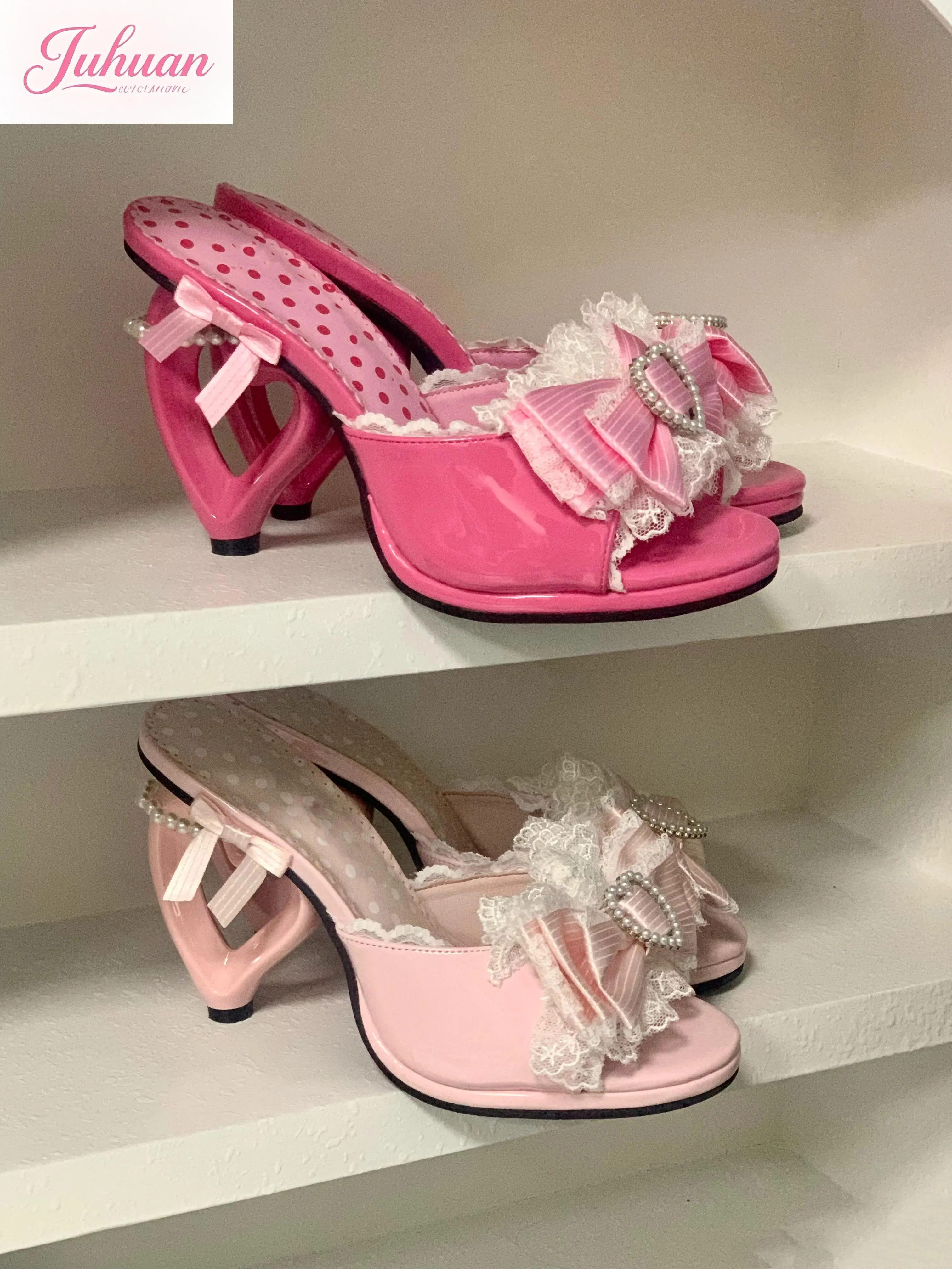 Sandali con tacco amore con fiocco rosa giapponese Abbigliamento esterno da donna 2025 Estate New Sweet Lolita Tacco alto Pantofola con una parola Scarpa da ragazza Kawaii