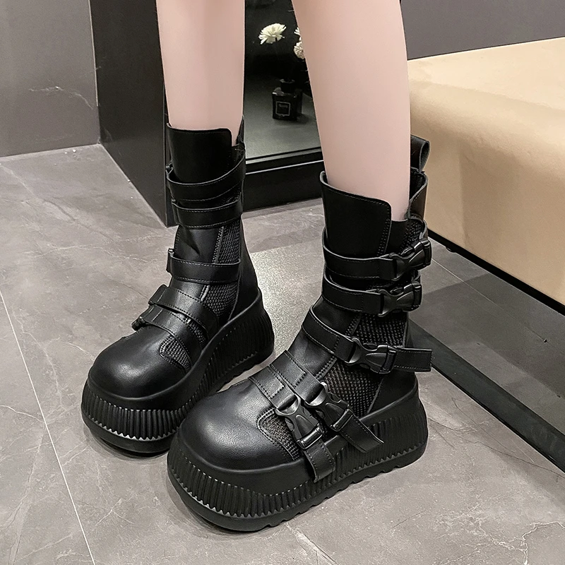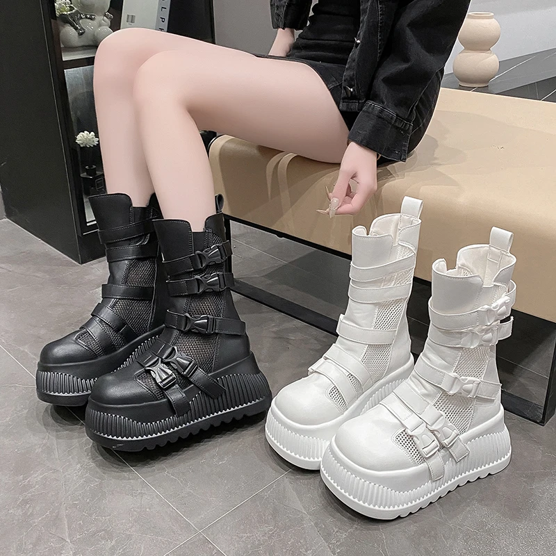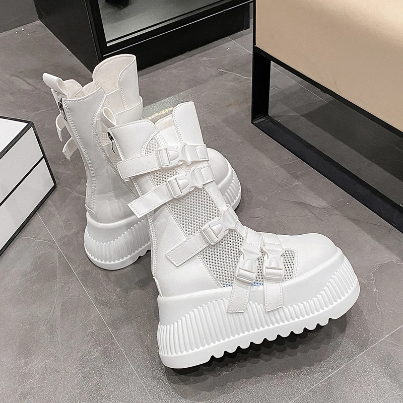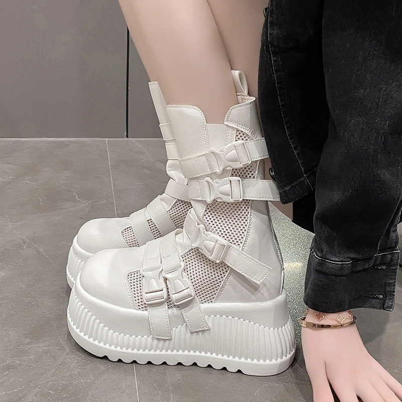 Sandali da donna estivi retrò centinaia maglia cava traspirante testa di panino suola spessa abbigliamento casual stivali alti freddi Zapatos De Mujer