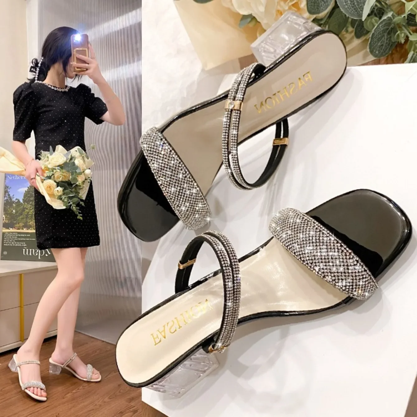 Sandali da donna in oro argento lucido estate 2024 tacchi alti in cristallo scarpe da festa donna comode diapositive con tacco spesso sandali Mujer