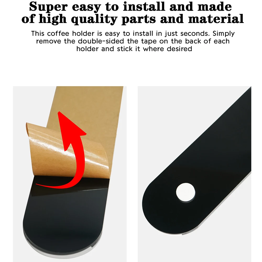 Questo porta caffè è facile da installare in soli secondi.Rimuovere semplicemente il nastro biadesivo sul retro di ciascuno titolare e incollare dove desiderato.