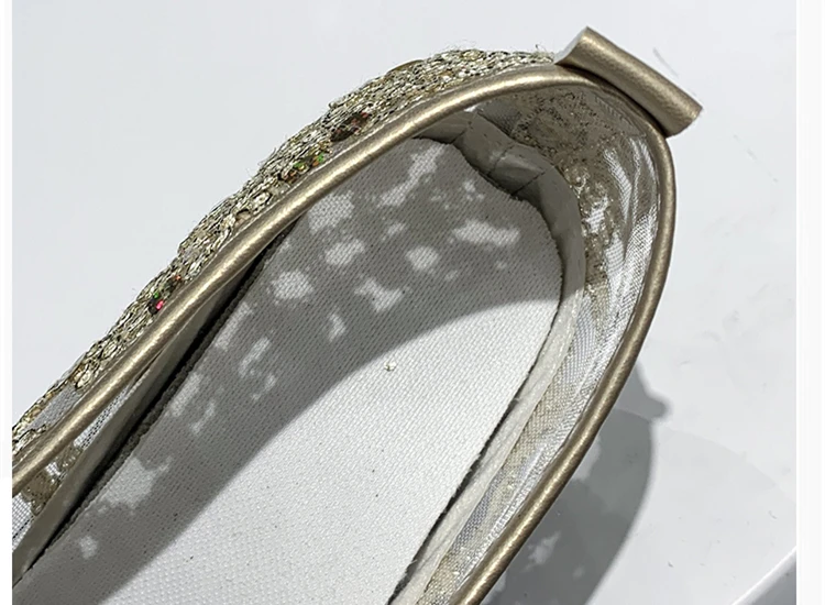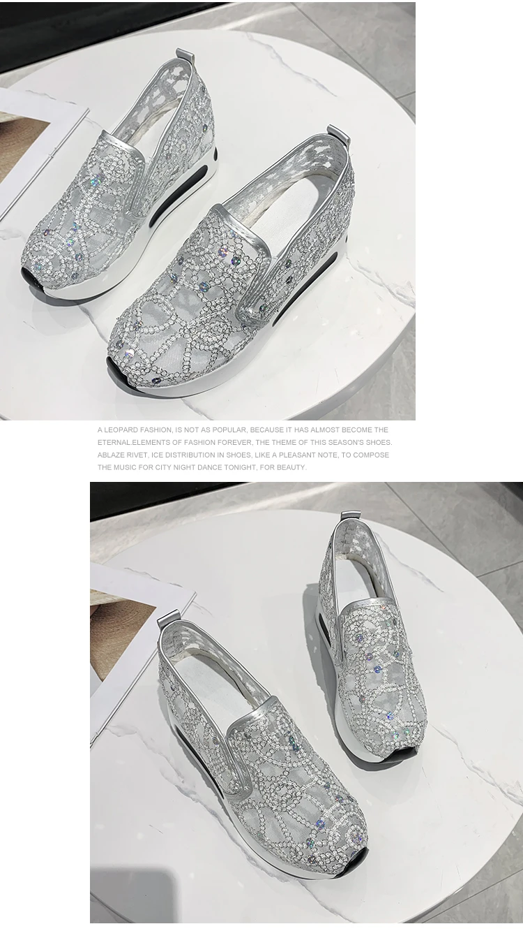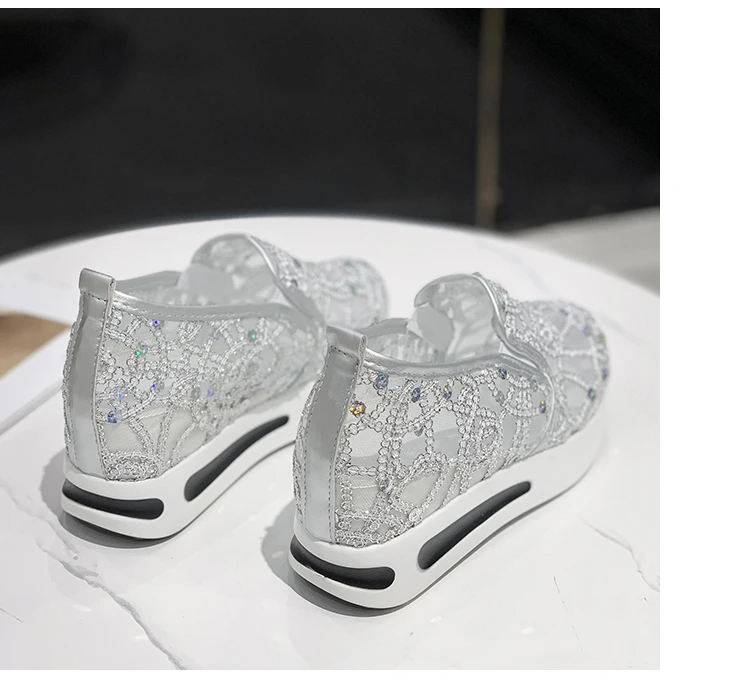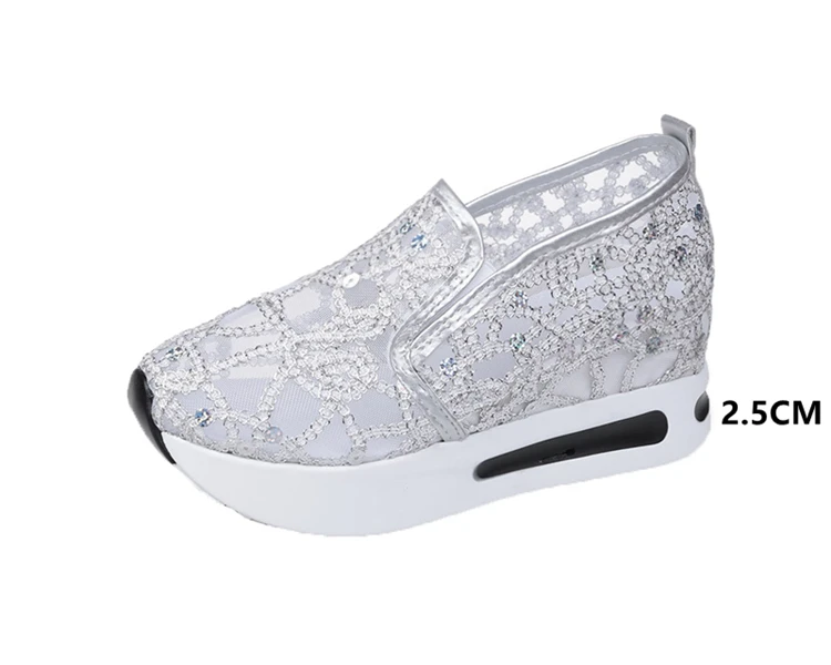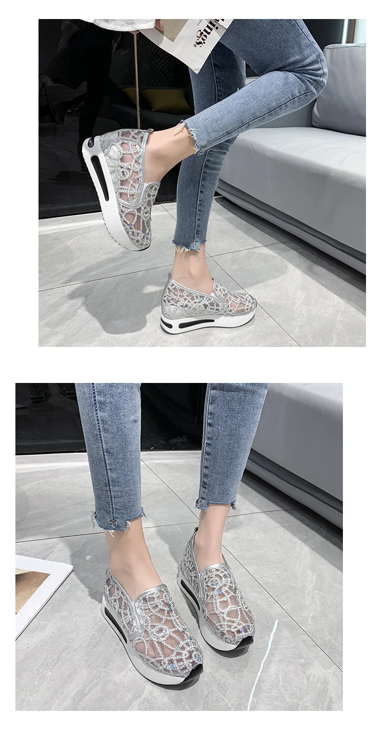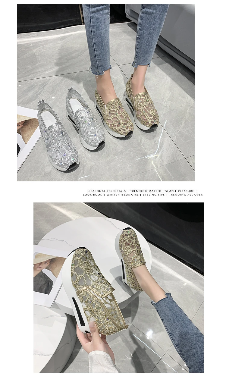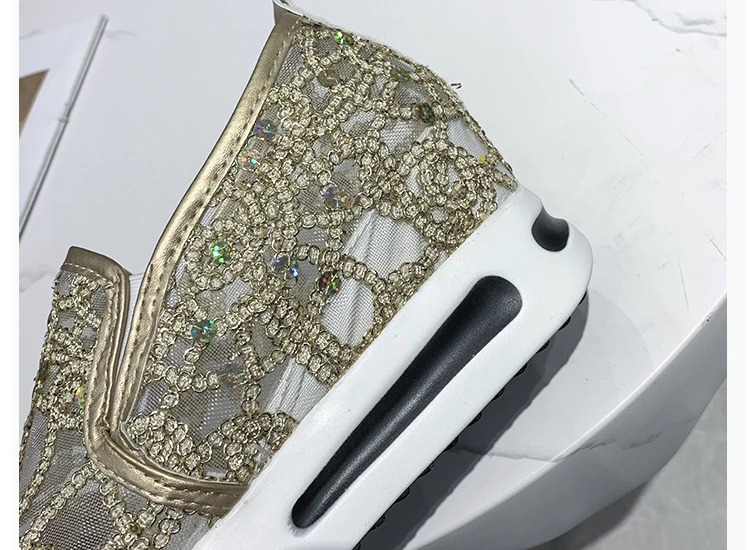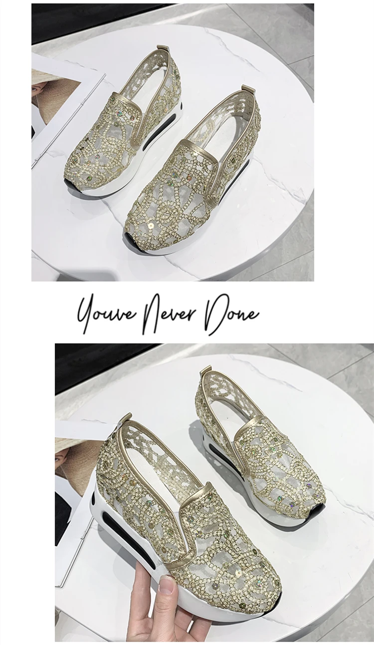 Scarpe casual con zeppa Donna Estate 2025 Scarpe vulcanizzate in rete con paillettes dorate Suola in gomma Slip on Comode sneakers basse femminili